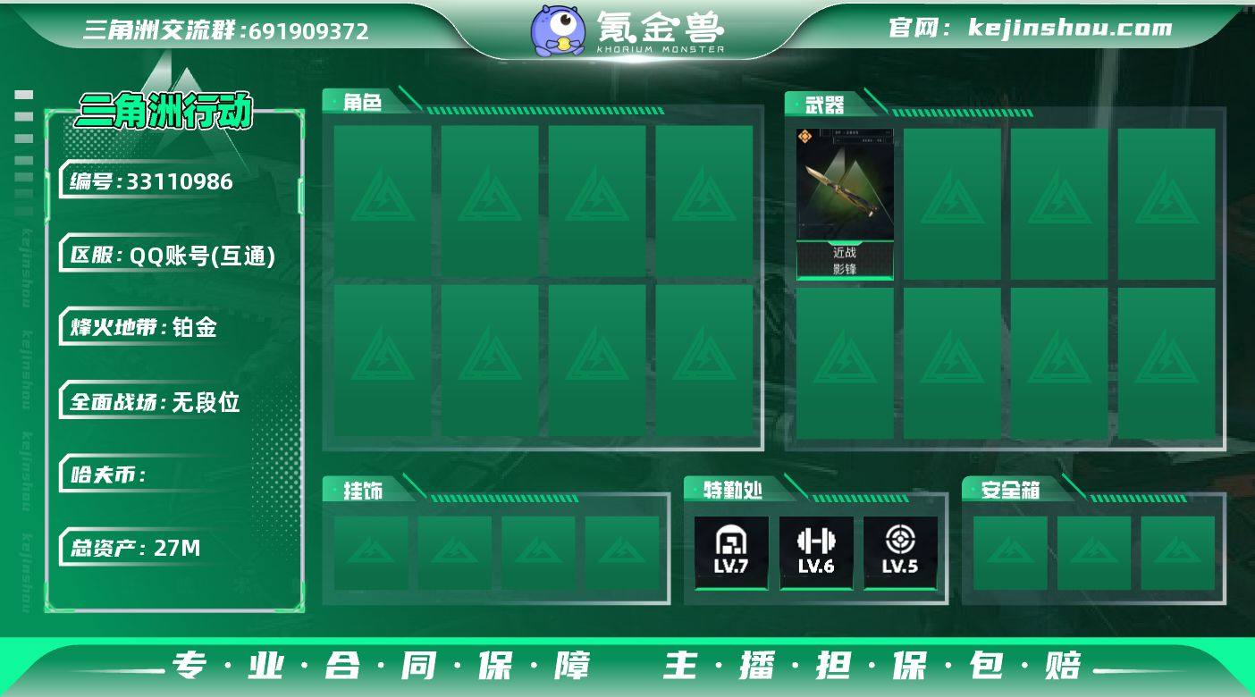 总资产:27.9M 1干员外观 1近战传说 6传说枪械 哈夫币:1.519K 不可修改实名 【烽火地带段位】钻石 【全面战场段位】无段位 【干员外观】红狼-电锯惊魂 【传说武器皮肤】近战-赤枭,M7战斗步枪-棱镜攻势S2(典藏),SG552突击步枪-运动员,M250通用机枪-骑士之心,M14射手步枪-电锯惊魂,SCAR-H战斗步枪-启航