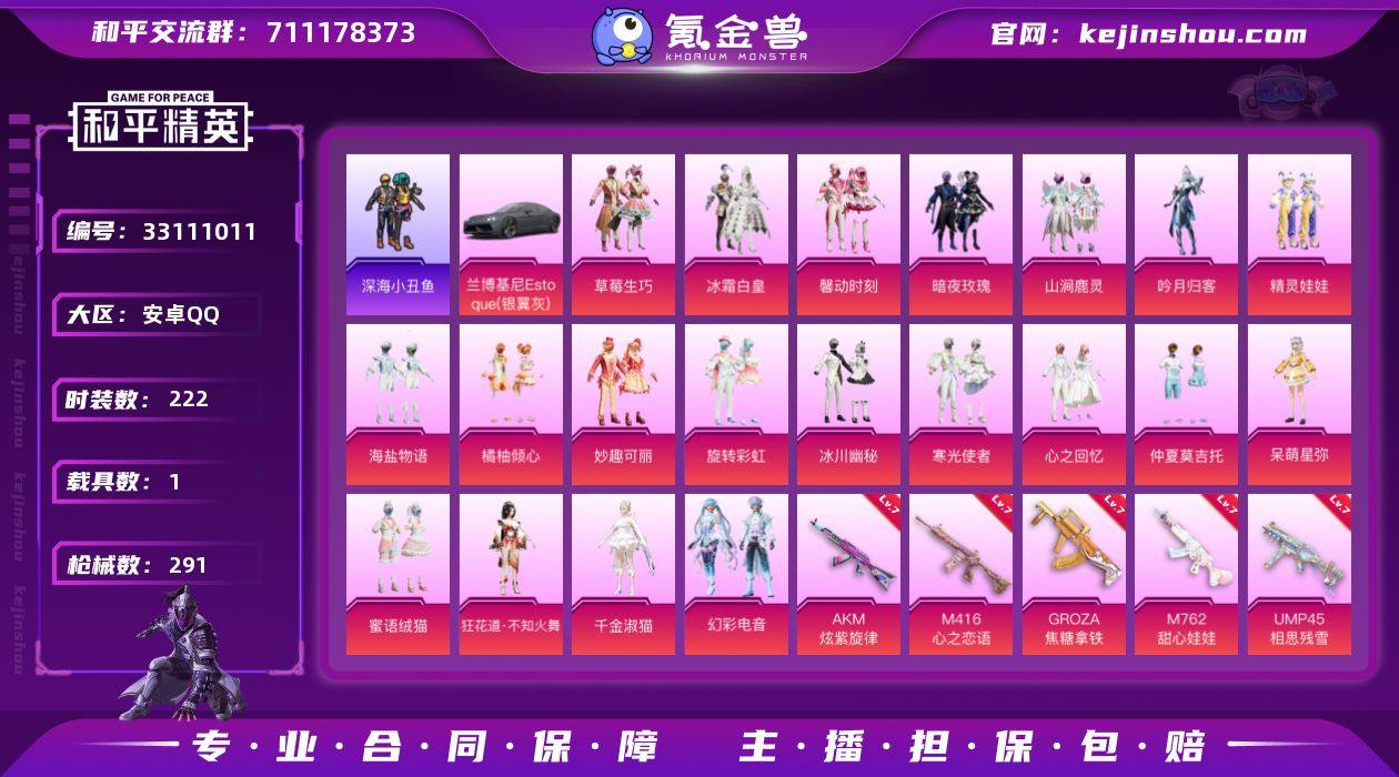 【kyhp1385】安卓 手Q-21粉装-11特效枪-1载具-3粉色飞行器-103354热力值-22王牌印记-222套装-291枪皮 【热门品类】:套装-浪漫天命,套装-深海小丑鱼,套装-小丑鱼,套装-龟仙人,套装-潮萌小黄鸭,套装-粉红小猪 【粉色套装】:粉装-草莓生巧,粉装-冰霜白皇,粉装-馨动时刻,粉装-暗夜玫瑰,粉装-山涧鹿灵,粉装-吟月归客,粉装-精灵娃娃,粉装-海盐物语,粉装-橘柚倾心,粉装-妙趣可丽,粉装-旋转彩虹,粉装-冰川幽秘,粉装-寒光使者,粉装-心之回忆,粉装-仲夏莫吉托,角色-呆萌星弥,粉装-蜜语绒猫,角色-狂花道·不知火舞,角色-千金淑猫,粉装-幻彩电音 【粉色枪皮等级】:AKM-炫紫旋律(七级),M416-心之恋语(七级),GROZA-焦糖拿铁(七级),M762-甜心娃娃(七级),UZI-筑梦精灵(四级),UMP45-相思残雪(七级),Kar98K-巳巳如意(四级),M249-蓝莓炮弹(五级),M249-绒雪飘舞(一级),M249-彩虹甜喵(五级),DP-28-千金淑猫(七级) 【粉色载具】:兰博基尼Estoque(银翼灰) 【粉色枪皮】:AKM-炫紫旋律,M416-心之恋语,GROZA-焦糖拿铁,M762-甜心娃娃,UZI-筑梦精灵,UMP45-相思残雪,Kar98K-巳巳如意,M249-蓝莓炮弹,M249-绒雪飘舞,M249-彩虹甜喵,DP-28-千金淑猫 【粉色飞...