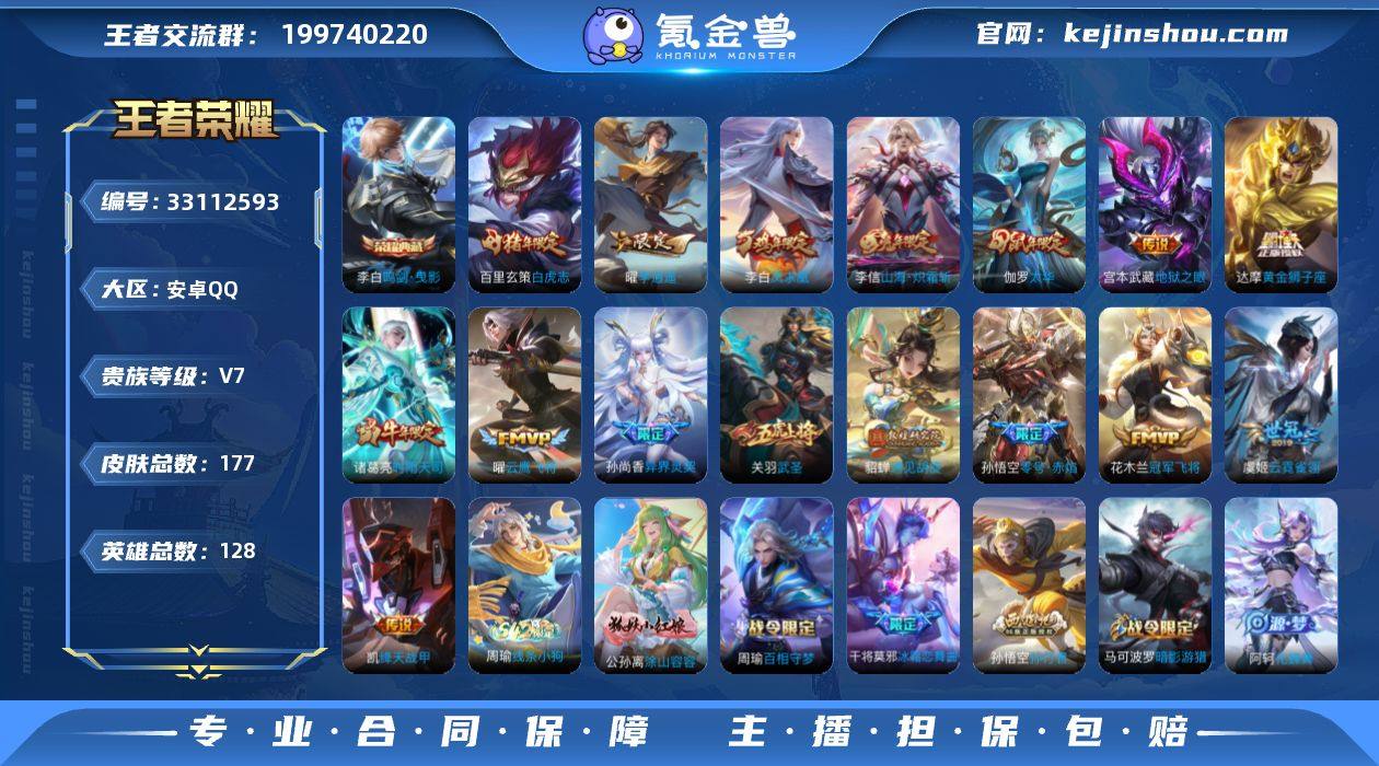 0B8BJV可二次水晶1传说16优质限定18 信用分合格 钱包已注销 水晶皮肤:鸣剑·曳影, 新传说限定:李逍遥, 传说限定:武圣,山海·炽霜斩,凤求凰,白虎志,遇见胡旋,时雨天司,异界灵契-孙尚香,太华,零号·赤焰, 传说皮肤:云霓雀翎,黄金狮子座,冠军飞将,地狱之眼,绛天战甲,云鹰飞将, 新史诗限定:涂山容容, 史诗限定:御风骁将,龙胆,飞衡,孙行者,幽恒,冰霜恋舞曲,辉光之辰, 优质史诗皮肤:修罗,赏金猎手,魅语, 周年皮肤:李小龙,江河有灵,梁祝,鹤鸣心笺,高山流水,五谷丰年, 珍宝阁:优雅恋人,蔷薇恋人, 史诗皮肤:圣诞狂欢,末日机甲-吕布,乘风破浪,功夫厨神,德古拉伯爵,水晶猎龙者,心灵战警,节奏热浪,鬼剑武藏,黎明之约,原初追逐者,纤云弄巧,缤纷独角兽,金属风暴,龙骑士,魅力维加斯,女仆咖啡,心灵骇客,偶像歌手,水果甜心,电玩小子,鹰眼统帅,逐浪之夏,特工魅影,乱世虎臣,乐园奇幻夜 贵族7 荣耀典藏1 传说皮肤16 史诗皮肤57 皮肤数量176 皮肤价值:146936 英雄127 永恒钻石III 总场次4753
