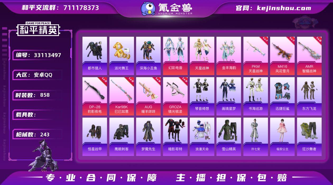 【特价出售】QQ钱包无法注销安卓Q-4稀有4粉装8特效枪16热门210套装243枪皮 74207热力值 6印记 历史超级王牌11星 【4稀有】 都市猎人 浪漫天命 派对舞王 派对舞王(金靴子) 【4粉装】 小舞雪昙 金丰海韵 天星战神 幻彩电音 【8特效枪】 Kar98K-巳巳如意 (5级) DP-28-豹影疾电 (5级) AUG-暖羊咩咩 (5级) PKM-天星战神 (7级) AMR-智耀战神 (6级) GROZA-镜光银凌 (5级) M416-风花雪月 (7级) Mk14-福马献瑞 (5级) 【16热门】 Mark.06 龟仙人 暗夜之虎 雪山精英 东方飞龙 梦魇先生 鹰眼刺客 暗夜之虎 迅捷狂鲨 深海小丑鱼 暗影哥特 粉红小猪 狂沙舞者 漫步者 破蛋小黄鸡 黑色刀锋 【2头盔】 金曜白虎头盔 幻影战神头盔 【2背包】 精灵迷巫背包 幻影战神背包