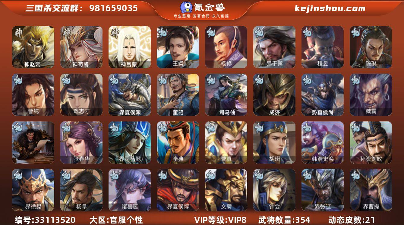 【14790029】官阶:骠骑将军;VIP等级:VIP8;史诗武将数量:22;动态皮肤数量:21;武将总数:354;史诗宝珠数量:0;将魂数量:2738;神将:2;魏国史诗武将:6;蜀国史诗武将:5;吴国史诗武将:2;群史诗武将:7