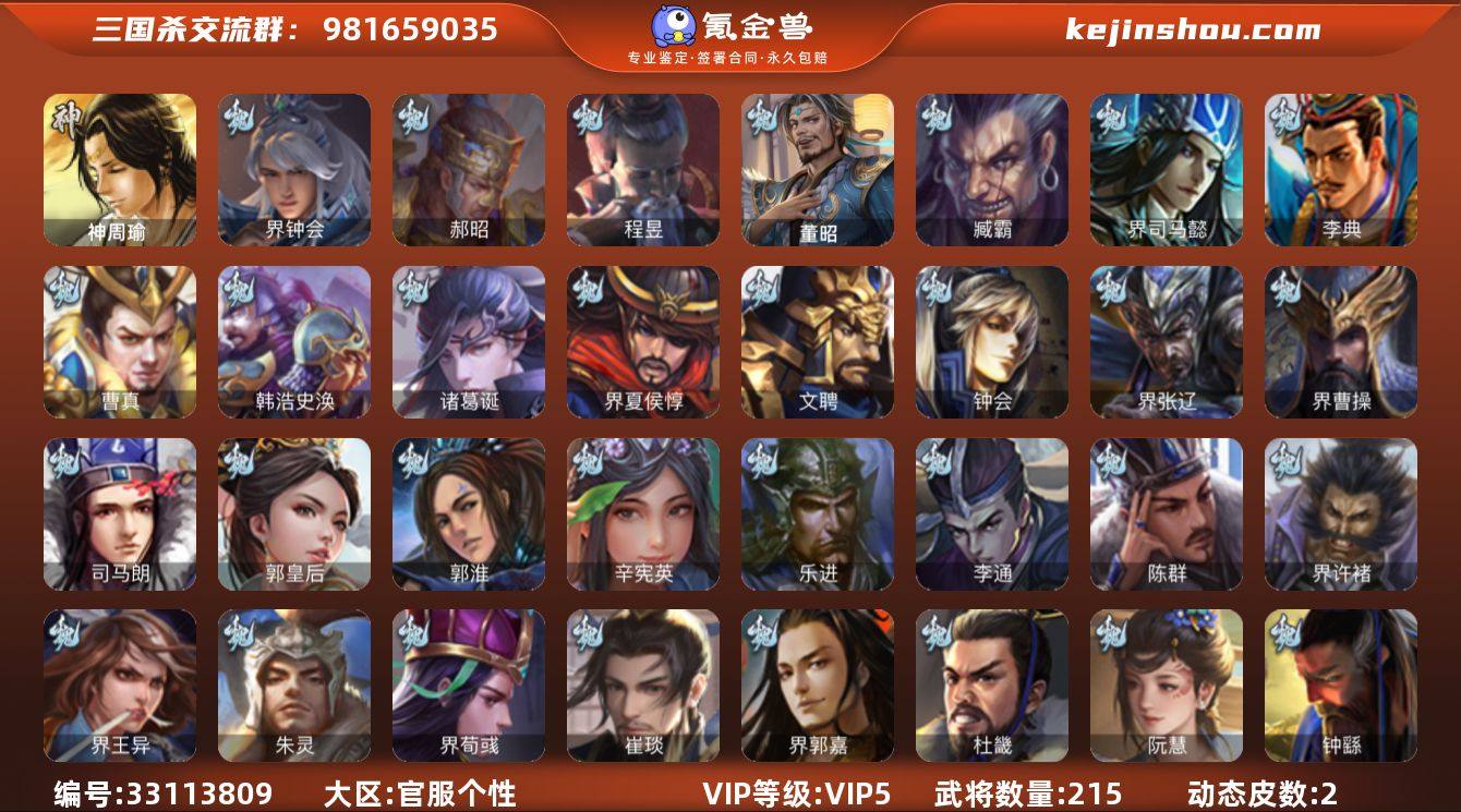 【14790036】官阶:中军将军;VIP等级:VIP5;史诗武将数量:5;动态皮肤数量:2;武将总数:215;史诗宝珠数量:66;将魂数量:3242;神将:0;魏国史诗武将:4;蜀国史诗武将:1;吴国史诗武将:0;群史诗武将:1