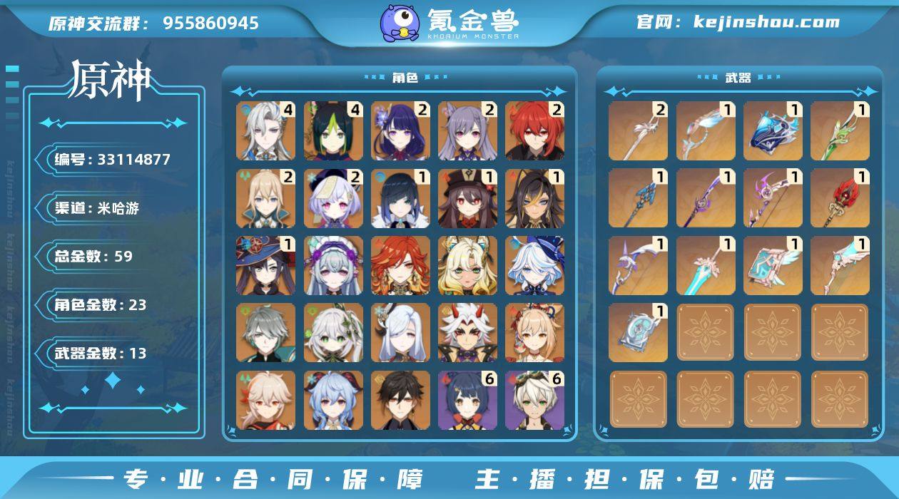 59黄! 冒险等级: 60 4命金色角色: 四命提纳里,四命那维莱特 2命金色角色: 二命迪卢克,二命七七,二命刻晴,二命琴,二命雷电将军 1命金色角色: 一命莫娜,一命胡桃,一命夜兰,一命迪希雅 0命金色角色: 枫原万叶,宵宫,钟离,甘雨,荒泷一斗,申鹤,纳西妲,艾尔海森,芙宁娜,希诺宁,玛薇卡,梦见月瑞希 拥有武器: 天空之翼,飞雷之弦振,四风原典,天空之卷,阿莫斯之弓,天空之傲,风鹰剑,护摩之杖,薙草之稻光,息灾,裁叶萃光,万世流涌大典,白雨心弦 2精武器: 风鹰剑 1精武器: 天空之翼,飞雷之弦振,四风原典,天空之卷,阿莫斯之弓,天空之傲,护摩之杖,薙草之稻光,息灾,裁叶萃光,万世流涌大典,白雨心弦