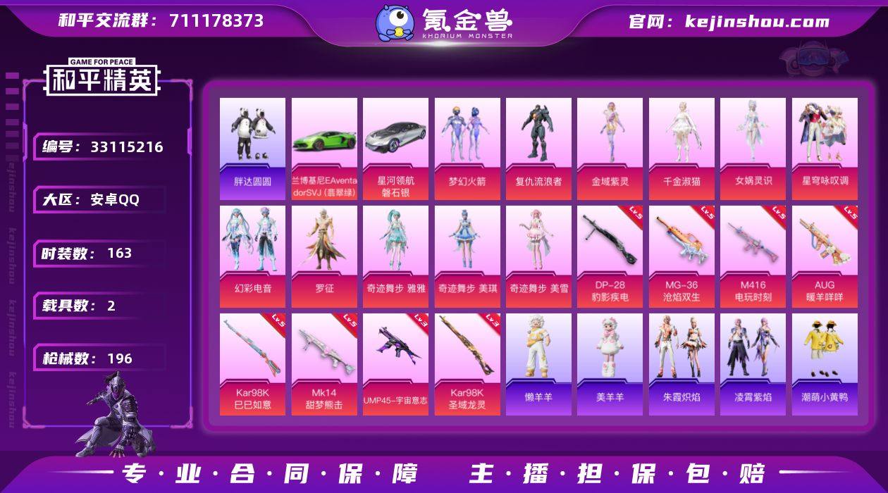 安卓 手Q-12粉装-10特效枪-2载具-8粉色飞行器-66704热力值-8王牌印记-163套装-196枪皮 【热门品类】:粉装-梦幻火箭,套装-胖达圆圆,套装-龟仙人,套装-潮萌小黄鸭,套装-浪漫波比 【粉色套装】:粉装-梦幻火箭,角色-复仇流浪者,角色-金域紫灵,角色-千金淑猫,角色-女娲灵识,粉装-星穹咏叹调,粉装-幻彩电音,角色-罗征,角色-奇迹舞步 雅雅,角色-奇迹舞步 美琪,角色-奇迹舞步 美雪 【粉色枪皮等级】:M416-电玩时刻(五级),AUG-暖羊咩咩(五级),ACE32-萌骑漫游(五级),UMP45-宇宙意志(三级),Kar98K-巳巳如意(五级),Kar98K-圣域龙灵(三级),Mk14-甜梦熊击(五级),Mk14-福马献瑞(五级),DP-28-豹影疾电(五级),MG-36-沧焰双生(五级) 【粉色载具】:兰博基尼Aventador SVJ(翡翠绿),星河领航(磐石银) 【粉色枪皮】:M416-电玩时刻,AUG-暖羊咩咩,ACE32-萌骑漫游,UMP45-宇宙意志,Kar98K-巳巳如意,Kar98K-圣域龙灵,Mk14-甜梦熊击,Mk14-福马献瑞,DP-28-豹影疾电,MG-36-沧焰双生 【粉色飞行器】:炫彩糖果飞行器,祥瑞起舞飞行器,齐天大圣飞行器,幽焰列车飞行器,彩虹独角兽飞行器,圣域金龙飞行器 【粉色降落伞】:星梦奇缘降落伞,时空协奏降落伞,精灵之...