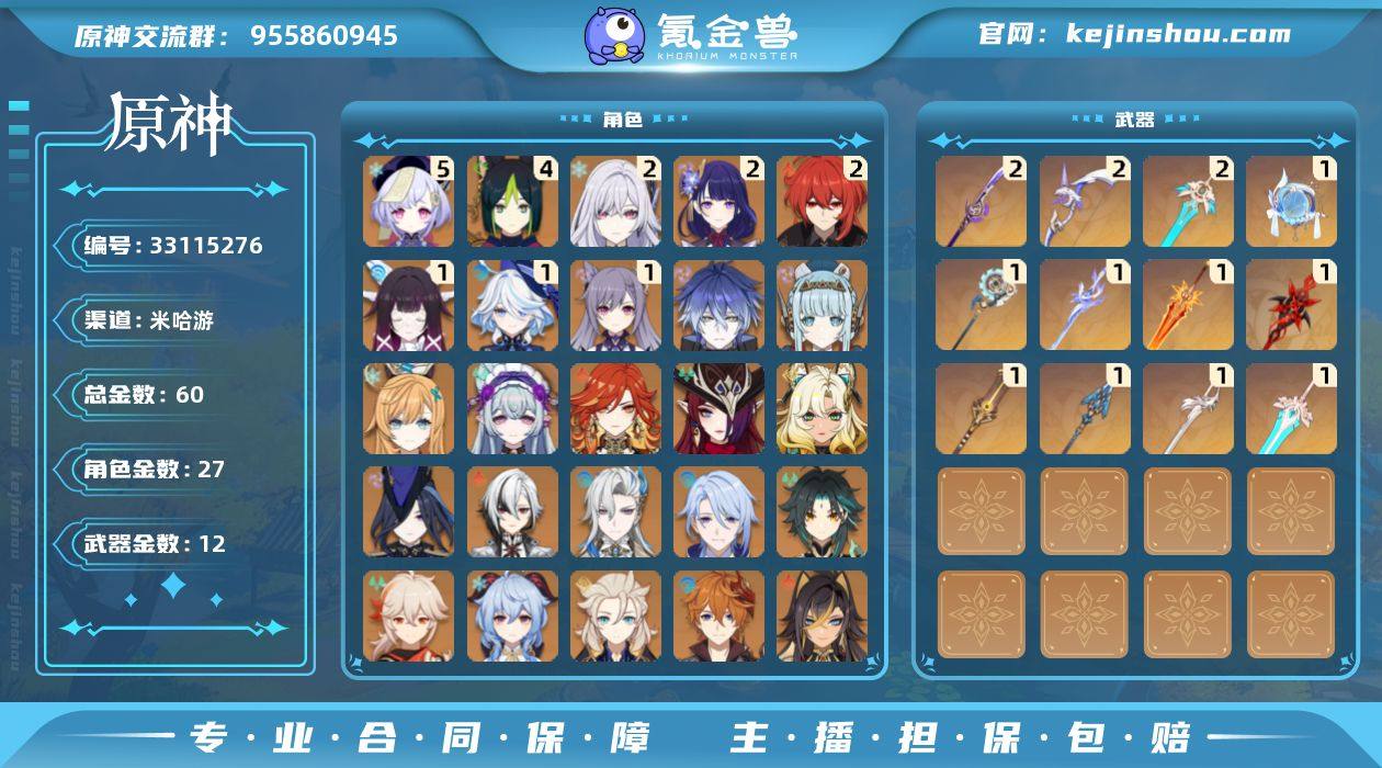 60黄! 冒险等级: 60 5命金色角色: 五命七七 4命金色角色: 四命提纳里 2命金色角色: 二命迪卢克,二命雷电将军,二命丝柯克 1命金色角色: 一命刻晴,一命芙宁娜,一命哥伦比娅 0命金色角色: 枫原万叶,达达利亚,莫娜,琴,阿贝多,甘雨,魈,神里绫人,迪希雅,那维莱特,阿蕾奇诺,克洛琳德,希诺宁,恰斯卡,玛薇卡,梦见月瑞希,爱可菲,伊涅芙,菲林斯 拥有武器: 阿莫斯之弓,天空之傲,风鹰剑,天空之刃,薙草之稻光,息灾,赤沙之杖,赤月之形,焚曜千阳,苍耀,支离轮光,帷间夜曲 2精武器: 阿莫斯之弓,天空之刃,薙草之稻光 1精武器: 天空之傲,风鹰剑,息灾,赤沙之杖,赤月之形,焚曜千阳,苍耀,支离轮光,帷间夜曲