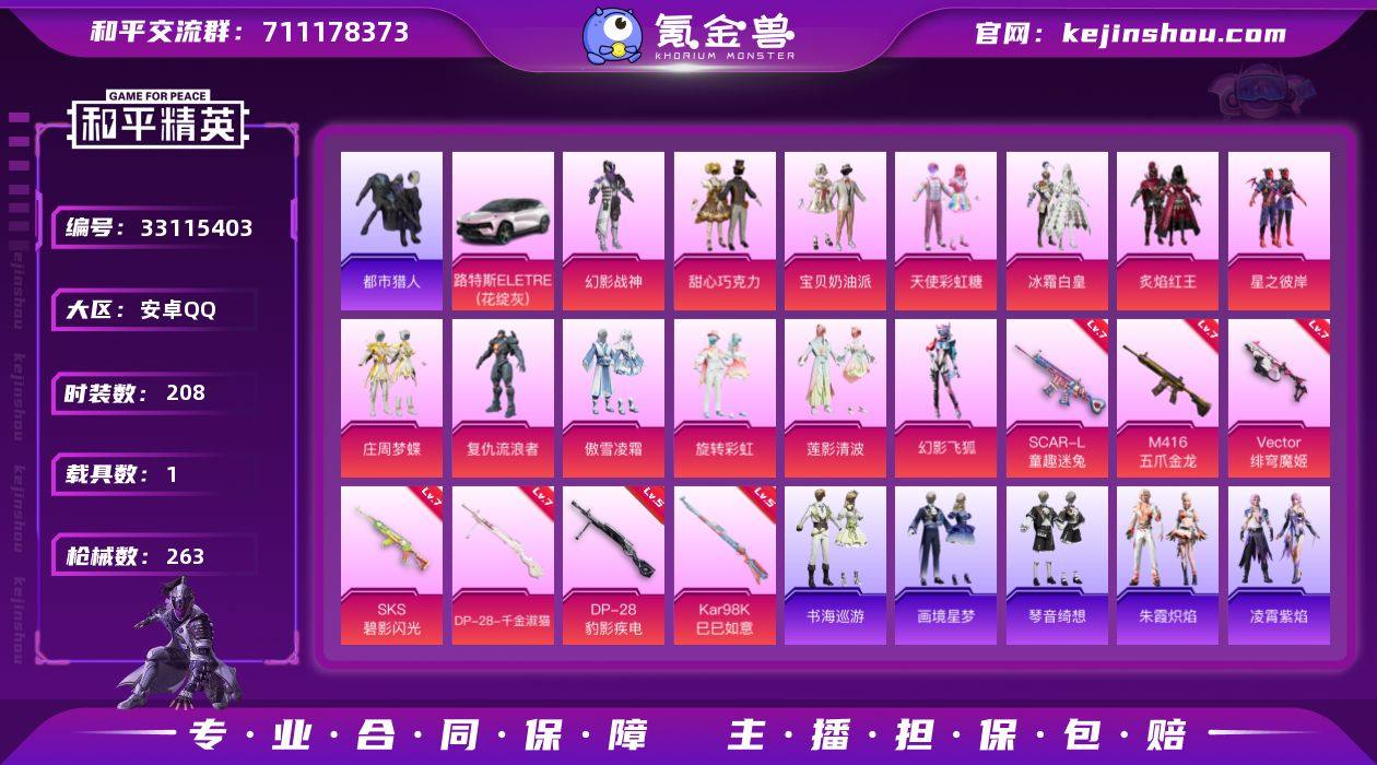 YZJ16718-不可二次-安卓Q-1稀有1载具13粉装10特效枪26热门【精品素材号 可萌可身法 高印记 74级传奇收藏家 多款热门满级常用特效枪 巧克力三姐妹 幻影战神 星之彼岸 旋转彩虹 傲雪凌霜 都市 兔兔白日梦 大橘为重 蓝螳螂 青涩年华 罗小黑 星夜迷魅 鲨鱼裤 红眼罩 童趣迷兔头盔 1级暮色之舞飞行器 伙伴-小拳击手 11款飞行器】208套装263枪皮 89272热力值 18印记 历史传奇王牌13星 【1稀有】 都市猎人 【1载具】 路特斯EL灰色 【13粉装】 宝贝奶油派 天使彩虹糖 甜心巧克力 幻影战神 幻影飞狐 莲影清波 冰霜白皇 炙焰红王 傲雪凌霜 星之彼岸 旋转彩虹 庄周梦蝶 复仇流浪者 【10特效枪】 M416-五爪金龙 (7级) AKS-74U-森灵之息 (5级) Kar98K-巳巳如意 (5级) Vector-绯穹魔姬 (7级) DP-28-千金淑猫 (7级) DP-28-豹影疾电 (5级) SCAR-L-童趣迷兔 (7级) Mk14-福马献瑞 (5级) AA12-G-萌骑幻想 (3级) SKS-碧影闪光 (7级) 【26热门】 Mark.06 龟仙人 青涩年华 仓鼠灰灰 鹰眼刺客 兔兔白日梦 奶芙汪汪 恶魔喵喵 迅捷狂鲨 大橘为重 罗小黑 暗夜契约 暗影哥特 醒狮腾龙 团圆交子 瑞龙福将 纯白誓言 粉红小猪 豚鼠丹丹 忍者信条 漫步者 破蛋小黄鸡 极速红龙 英勇保护者 弄潮海豚 M762-瑞龙福...