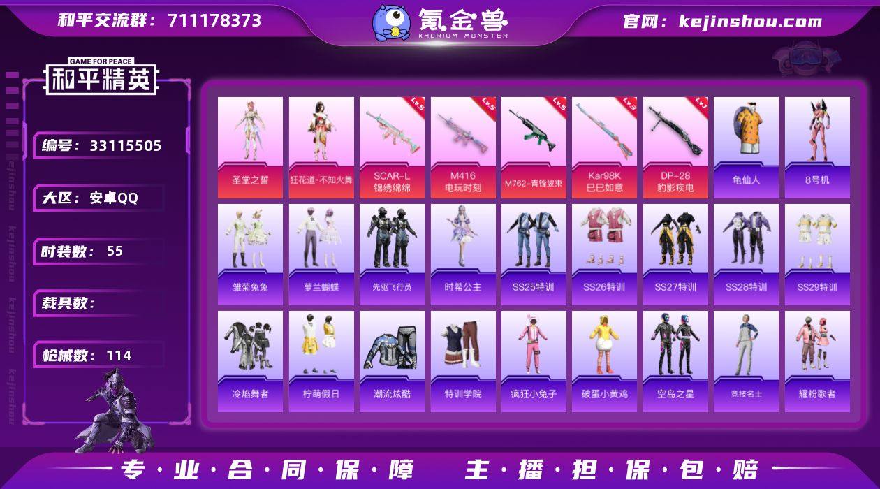 安卓 手Q-2粉装-7特效枪-0载具-1粉色飞行器-28700热力值-2王牌印记-55套装-114枪皮 【热门品类】:套装-龟仙人,角色-8号机 【粉色套装】:角色-圣堂之誓,角色-狂花道·不知火舞 【粉色枪皮等级】:SCAR-L-锦绣绵绵(五级),M416-电玩时刻(五级),M762-青锋波束(五级),ACE32-萌骑漫游(五级),Kar98K-巳巳如意(三级),Mk14-福马献瑞(五级),DP-28-豹影疾电(一级) 【粉色枪皮】:SCAR-L-锦绣绵绵,M416-电玩时刻,M762-青锋波束,ACE32-萌骑漫游,Kar98K-巳巳如意,Mk14-福马献瑞,DP-28-豹影疾电 【粉色飞行器】:炫彩糖果飞行器 【粉色降落伞】:圣堂之誓降落伞,江南烟雨降落伞,初号机 觉醒Ver.降落伞,金丰海韵降落伞,拳皇·狂花道降落伞,炫彩糖果降落伞 【稀有套装】:套装-龟仙人,套装-炫彩糖果,套装-马上来财,套装-迅捷龙虾,套装-雏菊兔兔,套装-萝兰蝴蝶,套装-先驱飞行员,角色-时希公主 【稀有枪皮】:AKM-2P战斗服款,AKM-破晓战魂,AKM-霓虹街区,M16A4-幻世战舞者,SCAR-L-炫彩节奏,M416-糯团青竹,AUG-2P战斗服款,M762-天降萌叽,M762-彩虹符号,G36C-星穹咏叹调,AC-VAL-天降萌叽,蜜獾-天降萌叽,UZI-啾咪啾咪,UZI-天降萌叽,UMP45-蓝色火焰,Vector-...