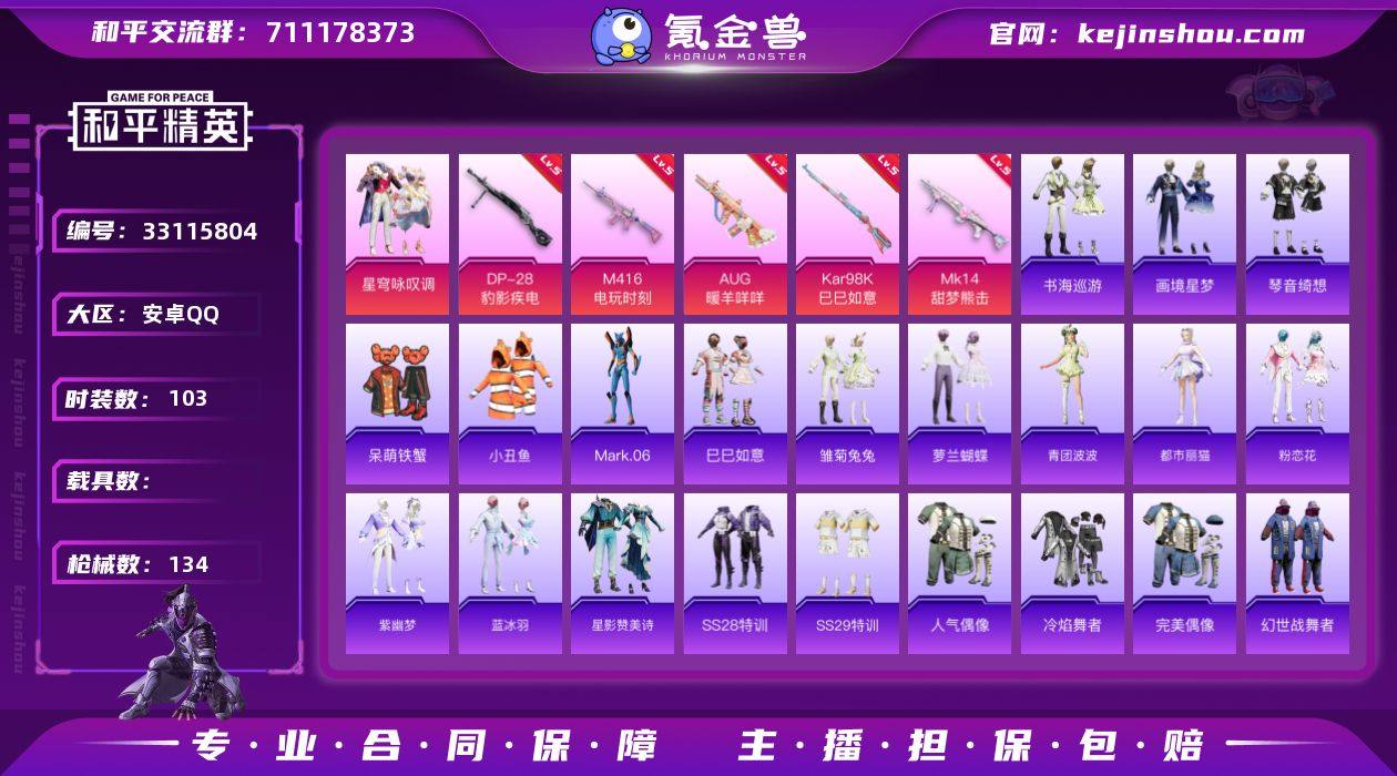 安卓 手Q-1粉装-8特效枪-0载具-1粉色飞行器-33024热力值-2王牌印记-103套装-134枪皮 【热门品类】:套装-小丑鱼,角色-Mark.06 【粉色套装】:粉装-星穹咏叹调 【粉色枪皮等级】:M416-电玩时刻(五级),AUG-暖羊咩咩(五级),UMP45-萌骑冒险(五级),AKS-74U-森灵之息(五级),Kar98K-巳巳如意(五级),Mk14-甜梦熊击(五级),Mk14-福马献瑞(五级),DP-28-豹影疾电(五级) 【粉色枪皮】:M416-电玩时刻,AUG-暖羊咩咩,UMP45-萌骑冒险,AKS-74U-森灵之息,Kar98K-巳巳如意,Mk14-甜梦熊击,Mk14-福马献瑞,DP-28-豹影疾电 【粉色飞行器】:炫彩糖果飞行器 【粉色降落伞】:幻影战神降落伞,初号机 觉醒Ver.降落伞,未来领航者降落伞,智耀战神降落伞,冷漠罗丽降落伞,炫彩糖果降落伞 【稀有套装】:套装-巳巳如意,套装-雪国风尚,套装-炫彩糖果,角色-魂电,角色-罗莉,角色-幸运青,套装-马上来财,套装-雏菊兔兔,套装-萝兰蝴蝶,套装-青团波波,角色-都市丽猫,套装-粉恋花,套装-紫幽梦,套装-蓝冰羽,套装-星影赞美诗,套装-书海巡游,套装-画境星梦,套装-琴音绮想,套装-雨过天青,套装-红釉青花 【稀有枪皮】:AUG-冰晶雪宝,AKM-缤纷海域,SCAR-L-夜灯,SCAR-L-炫彩节奏...