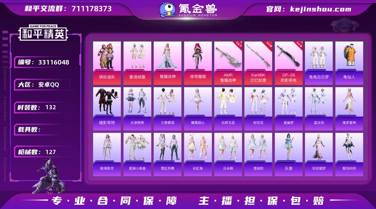 安卓 手Q-4粉装-6特效枪-0载具-1粉色飞行器-39280热力值-6王牌印记-132套装-127枪皮 【热门品类】:粉装-缤纷油彩,套装-龟仙人,套装-暗影哥特 【粉色套装】:粉装-缤纷油彩,粉装-蜜语绒猫,角色-智耀战神,角色-绯穹魔姬 【粉色枪皮等级】:UMP45-萌骑冒险(五级),Kar98K-巳巳如意(五级),Mk14-福马献瑞(三级),AMR-智耀战神(七级),DP-28-豹影疾电(三级) 【粉色枪皮】:UMP45-萌骑冒险,Kar98K-巳巳如意,Mk14-福马献瑞,AMR-智耀战神,DP-28-豹影疾电 【粉色飞行器】:夜幕颂歌飞行器 【粉色降落伞】:蜜语绒猫降落伞,智耀战神降落伞,星穹咏叹调降落伞,幻彩电音降落伞,时光之吻降落伞,炫彩糖果降落伞,镜花水月降落伞,霜月狼主降落伞 【稀有套装】:套装-龟仙人,套装-乐游熊熊,套装-兰香蝶语,套装-暖暖麦兜,套装-绿野诗集,套装-马上有钱,角色-糖霜甜心,套装-白辉玉蕊,套装-粉恋花,套装-紫幽梦,套装-蓝冰羽,角色-瑰梦爱神,角色-鲛海歌灵,套装-星渊小夜曲,套装-霓虹热舞,套装-彩虹兔,套装-云朵鹅,套装-雪绒豹,角色-乐音,角色-玫纹锢梦,角色-黯羽织刑,套装-蜜露汐语,套装-粉彩缠枝,套装-雨过天青,套装-红釉青花,角色-暖阳柴柴 【稀有枪皮】...
