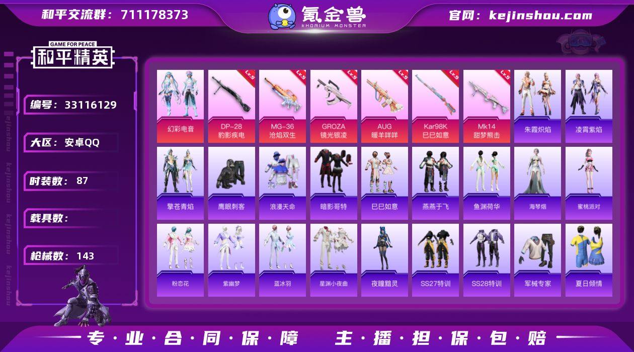 安卓 手Q-1粉装-10特效枪-0载具-1粉色飞行器-35486热力值-6王牌印记-87套装-143枪皮 【热门品类】:套装-浪漫天命,套装-暗影哥特 【粉色套装】:粉装-幻彩电音 【粉色枪皮等级】:GROZA-镜光银凌(五级),AUG-暖羊咩咩(五级),UMP45-萌骑冒险(五级),AKS-74U-森灵之息(五级),Kar98K-巳巳如意(五级),Mk14-甜梦熊击(五级),Mk14-福马献瑞(五级),AA12-G-萌骑幻想(四级),DP-28-豹影疾电(五级),MG-36-沧焰双生(五级) 【粉色枪皮】:GROZA-镜光银凌,AUG-暖羊咩咩,UMP45-萌骑冒险,AKS-74U-森灵之息,Kar98K-巳巳如意,Mk14-甜梦熊击,Mk14-福马献瑞,AA12-G-萌骑幻想,DP-28-豹影疾电,MG-36-沧焰双生 【粉色飞行器】:幻星舰长飞行器 【粉色降落伞】:创世·救赎降落伞,动力核心降落伞,智耀战神降落伞,百变魔方降落伞,异瞳寒姬降落伞,炫彩糖果降落伞 【稀有套装】:套装-巳巳如意,玩偶服-麦兜,角色-奈斯,角色-罗莉,套装-马上有钱,套装-迅捷龙虾,套装-燕燕于飞,套装-鱼渊荷华,角色-海琴烟,角色-蜜桃派对,套装-粉恋花,套装-紫幽梦,套装-蓝冰羽,套装-星渊小夜曲,角色-夜瞳黯灵,套装-朱霞炽焰,套装-凌霄紫焰,套装-擎苍青焰,套装-雨过天青,套装-红釉青花...