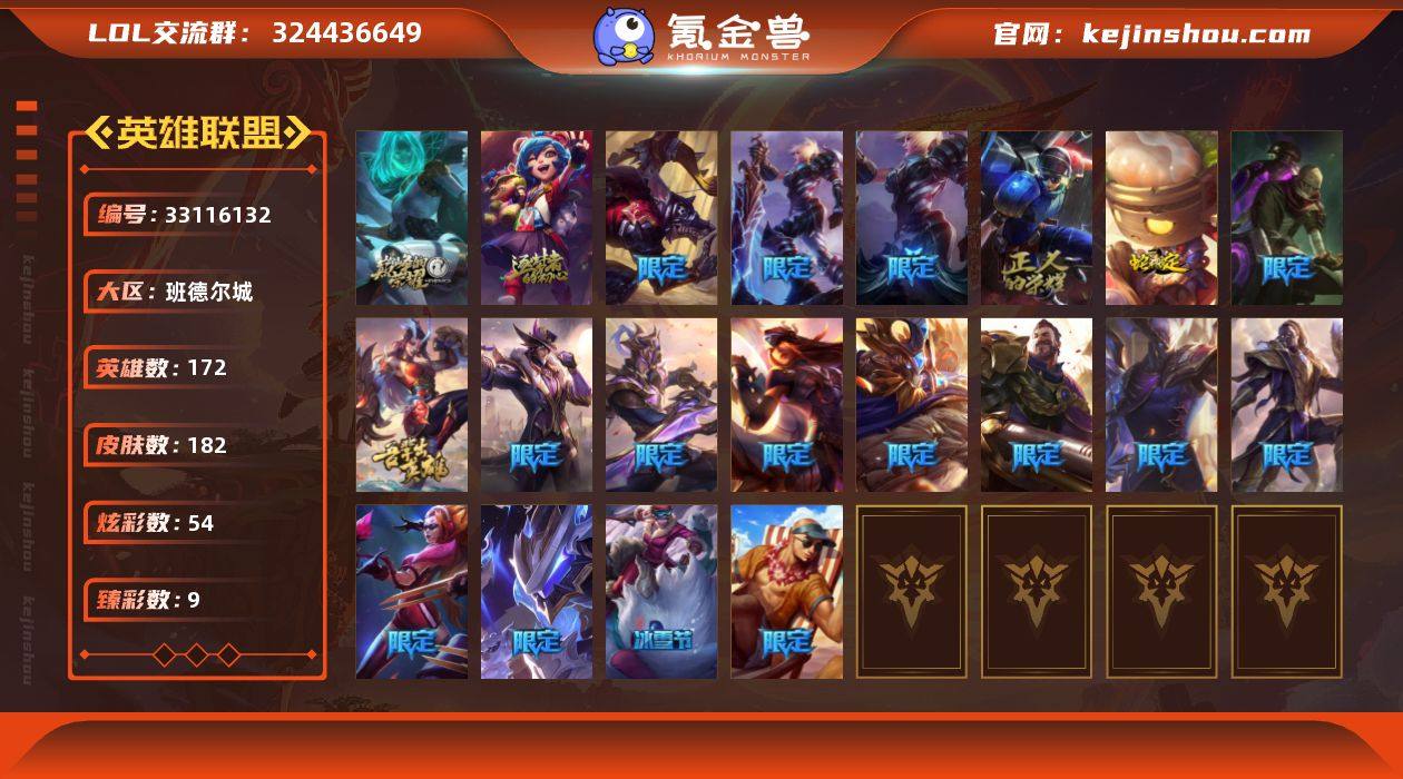 未定级段位-172英雄-182皮肤-54炫彩-0终极-2神话-22限定-16传说-42史诗 【珍稀头像】:红包头像 【神话皮肤】:十周年纪念安妮,源代码乐芙兰 【臻彩皮肤】:无畏骑士瑟庄妮赤子初心,西部魔影卢锡安贝利尔之怠,霸天巨兽雪崩墨菲特,灵魂莲华锐雯流火,玉剑传说寒潭夭夭胭脂,玉剑传说苍鸾丁香,魔女阿卡丽虚荣,红莲之刃锐雯 【年限皮肤】:点心宝贝阿木木,龙马烈焰波比 【冰雪限定】:胡桃夹子萨科,圣诞老人古拉加斯,魄罗骑士瑟庄妮 【限定皮肤】:冠军之刃锐雯,冠军之刃锐雯2016,SKTT1婕拉,DRX茂凯,暗裔英雄盖伦,胜利女神希维尔,胜利之树茂凯,胜利枪神格雷福斯,胜利之剑亚托克斯,胜利枪神卢锡安,胜利剑圣易,胜利之运崔斯特,泳池派对李青,都铎王朝图奇,玉剑传说舞龙卫,防暴天使凯尔,双城之战2微光实验室辛吉德 【传说皮肤】:血石领主弗拉基米尔,恶魔之刃泰达米尔,冰霜之刃艾瑞莉娅,最终BOSS维迦,战斗学院凯特琳,源计划泯灭雷克顿,神龙尊者圣龙李青,黯黑魔龙希瓦娜,光明哨兵格雷福斯,宇航员诺提勒斯,女校长菲奥娜,金牌主播德莱文,霸天异形卡兹克,灌篮高手德莱厄斯,影执事劫,真实伤害艾克 【史诗皮肤】:安伯斯与提妮,腥红之月崔斯特,...