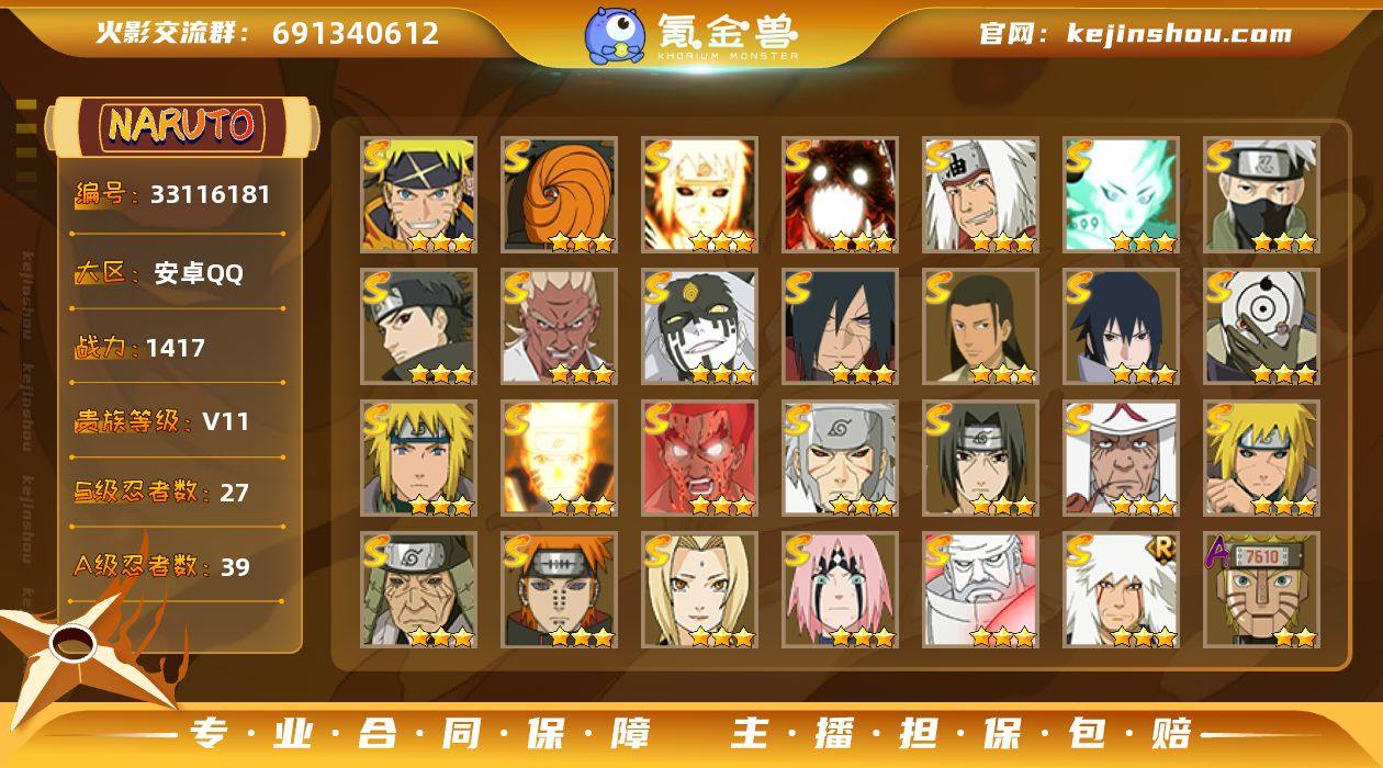 0BDHF2 号 VIP11,1417W战力,S忍27个,A忍42个,本服前100,战区未上榜,通灵兽20个,6时装,点券9,金币734,高招券16,上忍1阶,忍者星数514