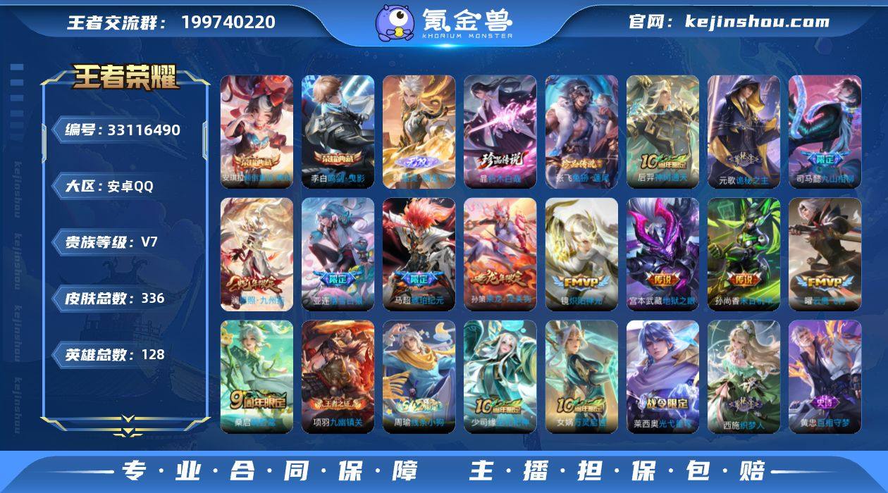 安卓Q-V7-最强王者段位-128英雄-336皮肤-2典藏皮肤-1无双-2珍品传说-12传说-83史诗 【英雄全皮】:刘禅全皮,元歌全皮,司马懿全皮,孙权全皮,苍全皮,暃全皮,空空儿全皮,姬小满全皮,少司缘全皮 【荣耀典藏】:李白鸣剑曳影,安琪拉颠倒童话魔镜 【无双皮肤】:曜器灵螭龙剑 【珍品传说】:暃朽木白哉,张飞兔狲蓬尾 【传说皮肤】:后羿神树通天,元歌诡秘之主,司马懿九山相柳,澜愿照九州拓,桑启鸣野蒿,亚连落雪白狼,孙策乘龙淬吴钩,马超琥珀纪元,镜炽阳神光,曜云鹰飞将,孙尚香末日机甲,宫本武藏地狱之眼 【限定皮肤】:暃埋骨钱,蒙犽顽岩魄,蔡文姬夏日便利店,大乔绒语心约,虞姬夏日便利店,姜子牙天穹之誓,狄仁杰阴阳师,赵云皇家上将,墨子降魔,孙尚香蔷薇恋人,元歌云间偶戏,元歌无心,马可波罗暗影游猎,狄仁杰魔术师,达摩沙漠行僧,项羽海滩派对,安琪拉魔法小厨娘,程咬金演武夺筹,兰陵王驯魔猎人,兰陵王金庭之子,李元芳银河之约,李元芳云中旅人,钟馗神迹守卫,钟馗驱傩正仪,干将莫邪胡桃夹子,鬼谷子五谷丰年,苏烈千军破阵,百里玄策原初追逐者,沈梦溪大漠名商,裴擒虎李小龙,裴擒虎擒涛扼浪,云中君纤云弄巧,嫦娥拒霜思,蒙犽狂想玩...