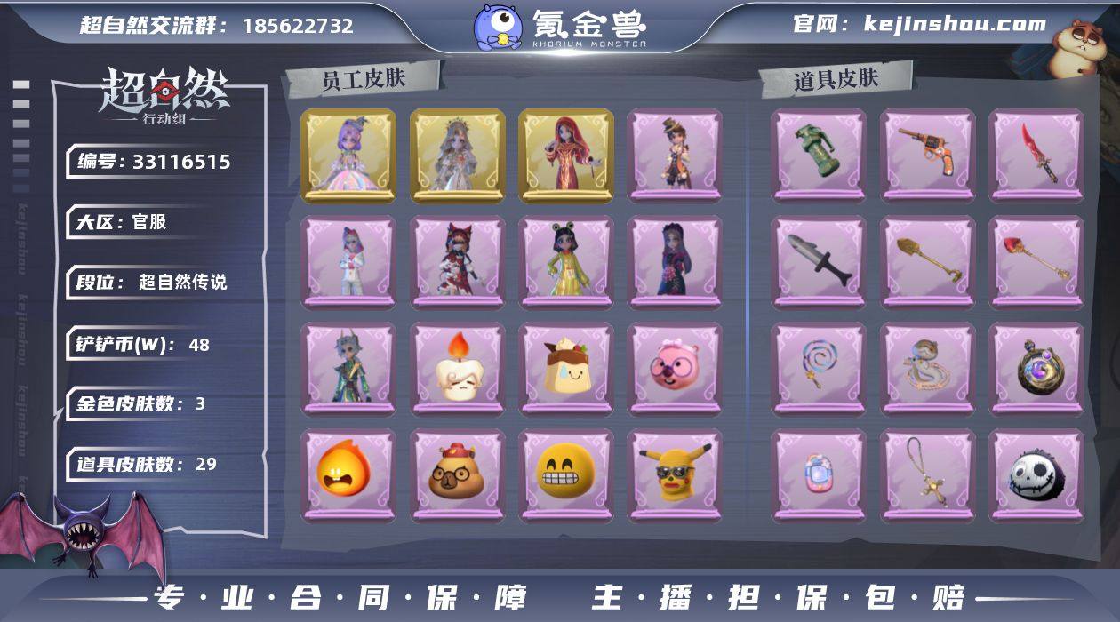ZR537,金皮:3,紫皮:6,道具皮:29,外观:薇薇安-圣光之谕,小黄-遗失的童话,巫铃儿-镜花辞,阿念-庆宴绮愿,艾伦-绒绒对决,莉莉-莓果陷阱,逍遥-泽引山海,爱丽丝-丝缕哀歌,小黄-呱呱雨衣,道具:腰包-宝剑八,闪光弹-金戈玄铜,黄牛能量饮料-青玉抱丹,长鞭-飞天绫,音响-鸣沙鼓,转轮手枪-新星时代,腰包-惊魂娃娃,刺刀-小鲨匕首,摸金符-祝祷词,音响-happy猫,铲子-圣心之泪,黄牛能量饮料-珍珠芭乐莓莓,铲子-龙鳞,传送按钮-逆时审判,长鞭-小狗蛇点点鞭,额外的背包-飞花令,传送按钮-幻宠之门,刺刀-赤色之刃,急救包-蔷薇物语,专业手电-云端梦想计划,夜视仪-金丝眼镜,背饰-潮汐小海兔,背饰-兔先生的时钟,背饰-云梦之星,背饰-天使的呼唤,背饰-蝶恋花,员工:小满,临云,小黄,爱丽丝,零,阿念,逍遥,薇薇安,巫铃儿,莉莉,艾伦,爱德华,兰,动作:金城舞,luvaboy,鸳鸯戏,DL摇,鹏友摇,心跳摇,伤心摇,小雨摇,舞台中心,带你逃跑吧,举牌,抬手,头饰:腊肠扭扭,烛光纪念,蒜了八,樱桃奶油布丁,惊魂南瓜头套,精致露比头套,小财神豚豚头套,鱼头怪头套,烈焰红唇头套,大葱明头套,火爆了头套,面具马头套,哈士奇头套,萨卡班甲鱼头套,嘻嘻头套,滑稽头套,呆滞头套,卑微头套,鳄霸天头套,驼半仙头套,小狗蛇点点头套,炙热烧烤,粽...