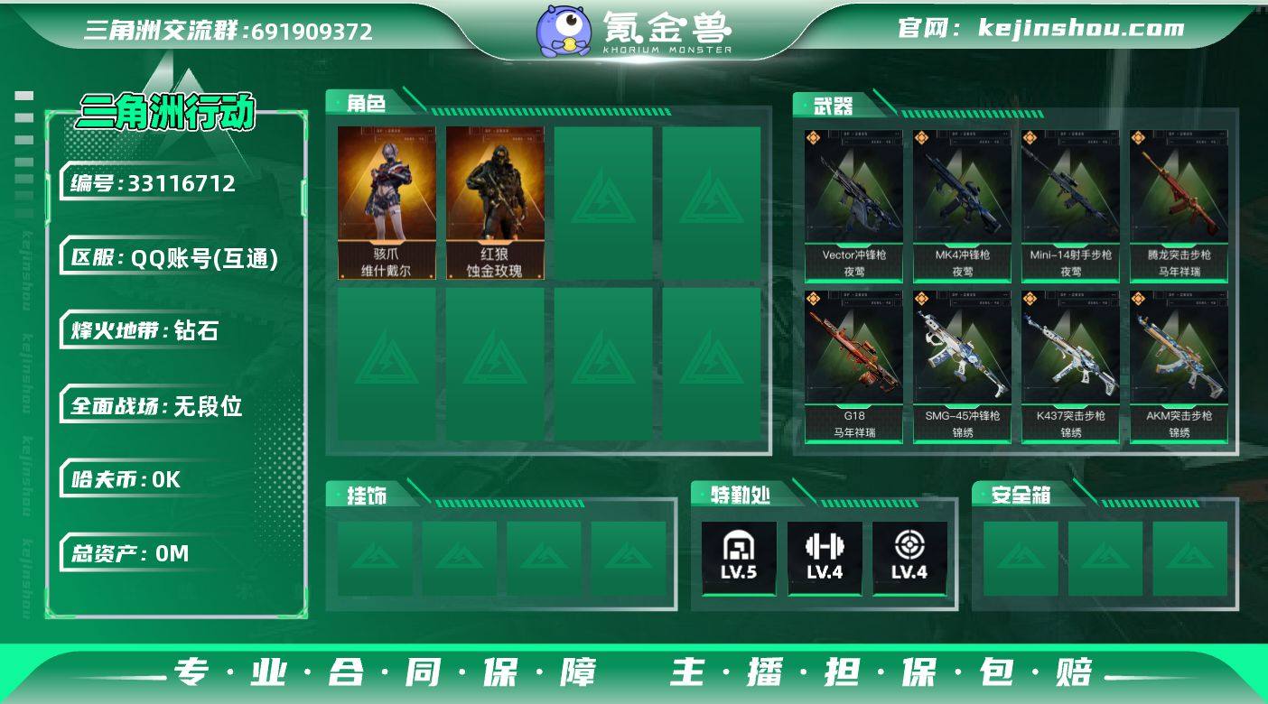 实名: 可修改 烽火地带段位: 钻石 全面战场段位: 无段位 总资产: 48 哈夫币: 4 干员外观: 红狼-蚀金玫瑰,骇爪-维什戴尔 传说武器皮肤: M4A1突击步枪-蚀金玫瑰,M4A1突击步枪-阿米娅,AWM狙击步枪-捞点薯条,勇士冲锋枪-能天使-午夜邮差,R93狙击步枪-维什戴尔,SCAR-H战斗步枪-启航,ASh-12战斗步枪-鹅鸭杀,QCQ171冲锋枪-鹅鸭杀,QJB201轻机枪-鹅鸭杀,腾龙突击步枪-马年祥瑞,G18-马年祥瑞,Vector冲锋枪-夜莺,MK4冲锋枪-夜莺,Mini-14射手步枪-夜莺,勇士冲锋枪-万金泪冠,腾龙突击步枪-万金泪冠,SMG-45冲锋枪-锦绣,K437突击步枪-锦绣,AKM突击步枪-锦绣