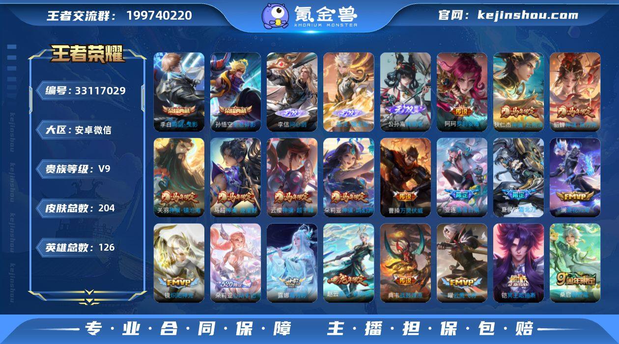 安卓WX-V9-最强王者段位-126英雄-204皮肤-2典藏皮肤-3无双-31传说-49史诗