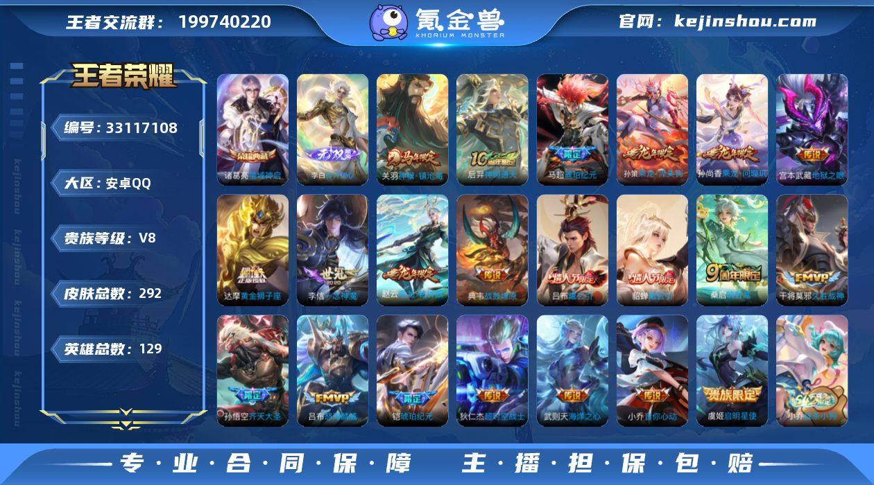 实名: 可修改 性别: 男号 贵族等级: V8 英雄数: 129 皮肤数: 292 荣耀水晶: 星域神启 无双皮: 碎月剑心 传说皮: 黄金狮子座,久胜战神,一念神魔,音你心动-小乔,海洋之心,地狱之眼,超时空战士-狄仁杰,琥珀纪元铠,琥珀纪元马超,乘龙·问璇玑,乘龙·铭钟鼎,乘龙·淬吴钩,貂蝉曦玄引,吕布曦玄引,典韦战鼓燎原,神树通天,神骥·镇沧海 限定皮: 梁祝,天狼征服者,朱雀志,玉兔公主,五谷丰年,怒海麟威,山海·玄木吟,山海·碧波行,齐天大圣,鸣野蒿,逐霄战戟 亮点: 【优质装备】:星域神启(倪克斯贼亮),碎月剑心(李白无双),黄金狮子座,久胜战神,一念神魔,音你心动-小乔,海洋之心,地狱之眼,超时空战士-狄仁杰,琥珀纪元铠,琥珀纪元马超