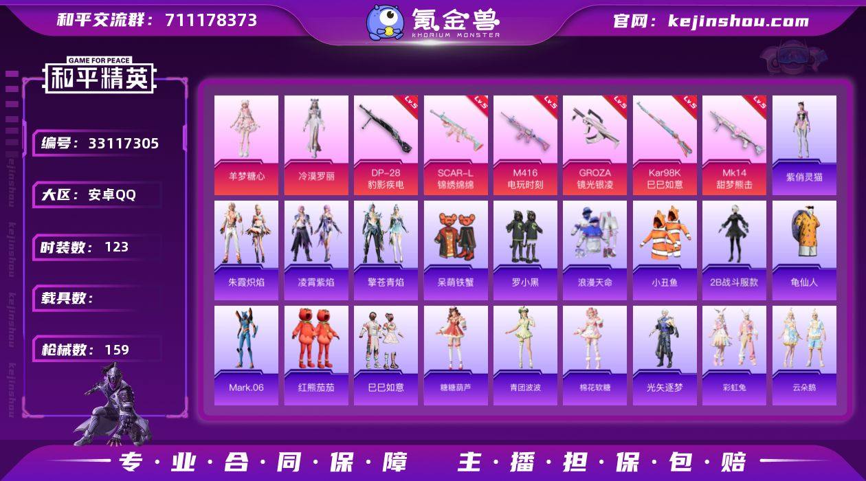 安卓 手Q-2粉装-8特效枪-0载具-1粉色飞行器-43244热力值-8王牌印记-123套装-159枪皮 【热门品类】:套装-浪漫天命,套装-小丑鱼,角色-2B战斗服款,套装-龟仙人,角色-Mark.06,套装-红熊茄茄 【粉色套装】:角色-冷漠罗丽,角色-羊梦糖心 【粉色枪皮等级】:SCAR-L-锦绣绵绵(五级),M416-电玩时刻(五级),GROZA-镜光银凌(五级),UMP45-萌骑冒险(五级),Kar98K-巳巳如意(五级),Mk14-甜梦熊击(五级),Mk14-福马献瑞(五级),DP-28-豹影疾电(五级) 【粉色枪皮】:SCAR-L-锦绣绵绵,M416-电玩时刻,GROZA-镜光银凌,UMP45-萌骑冒险,Kar98K-巳巳如意,Mk14-甜梦熊击,Mk14-福马献瑞,DP-28-豹影疾电 【粉色飞行器】:炫彩糖果飞行器 【粉色降落伞】:环太平洋降落伞,圣堂之誓降落伞,喜羊羊与灰太狼降落伞,异瞳寒姬降落伞,炫彩糖果降落伞 【稀有套装】:套装-龟仙人,套装-巳巳如意,套装-雪国风尚,套装-炫彩糖果,套装-马上有钱,套装-糖糖葫芦,套装-青团波波,套装-棉花软糖,角色-光矢逐梦,套装-彩虹兔,套装-云朵鹅,套装-雪绒豹,角色-灵公主,角色-绛羽幽主,套装-朱霞炽焰,套装-凌霄紫焰,套装-擎苍青焰,角色-紫俏灵猫 【稀有枪皮】:AKM-2P战斗服款,AKM-缤纷海...