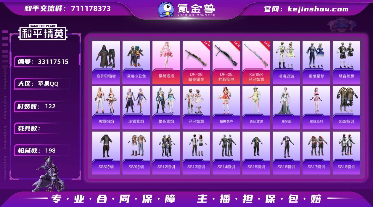 苹果 手Q-1粉装-8特效枪-0载具-1粉色飞行器-55634热力值-18王牌印记-122套装-198枪皮 【热门品类】:套装-深海小丑鱼,套装-奇异狩猎者 【粉色套装】:角色-樱桃泡泡 【粉色枪皮等级】:ACE32-萌骑漫游(四级),UMP45-萌骑冒险(二级),AKS-74U-森灵之息(五级),Kar98K-巳巳如意(五级),Mk14-福马献瑞(五级),AA12-G-萌骑幻想(二级),DP-28-暗夜鎏金(七级),DP-28-豹影疾电(五级) 【粉色枪皮】:ACE32-萌骑漫游,UMP45-萌骑冒险,AKS-74U-森灵之息,Kar98K-巳巳如意,Mk14-福马献瑞,AA12-G-萌骑幻想,DP-28-暗夜鎏金,DP-28-豹影疾电 【粉色飞行器】:炫彩糖果飞行器 【粉色降落伞】:绝对恒星降落伞,垂柳戏鸭降落伞,音爆索尼克降落伞,圣堂之誓降落伞,星梦奇缘降落伞,临安公主降落伞,喜羊羊与灰太狼降落伞,异瞳寒姬降落伞,炫彩糖果降落伞 【稀有套装】:套装-巳巳如意,套装-雪国风尚,套装-炫彩糖果,套装-马上有钱,套装-迅捷龙虾,套装-糖糖葫芦,套装-青团波波,角色-海琴烟,角色-蜜桃派对,套装-朱霞炽焰,套装-凌霄紫焰,套装-擎苍青焰,套装-书海巡游,套装-画境星梦,套装-琴音绮想,套装-雨过天青,套装-红釉青花 【稀有枪皮】:AUG-冰晶雪宝,AKM-夜灯,AKM...