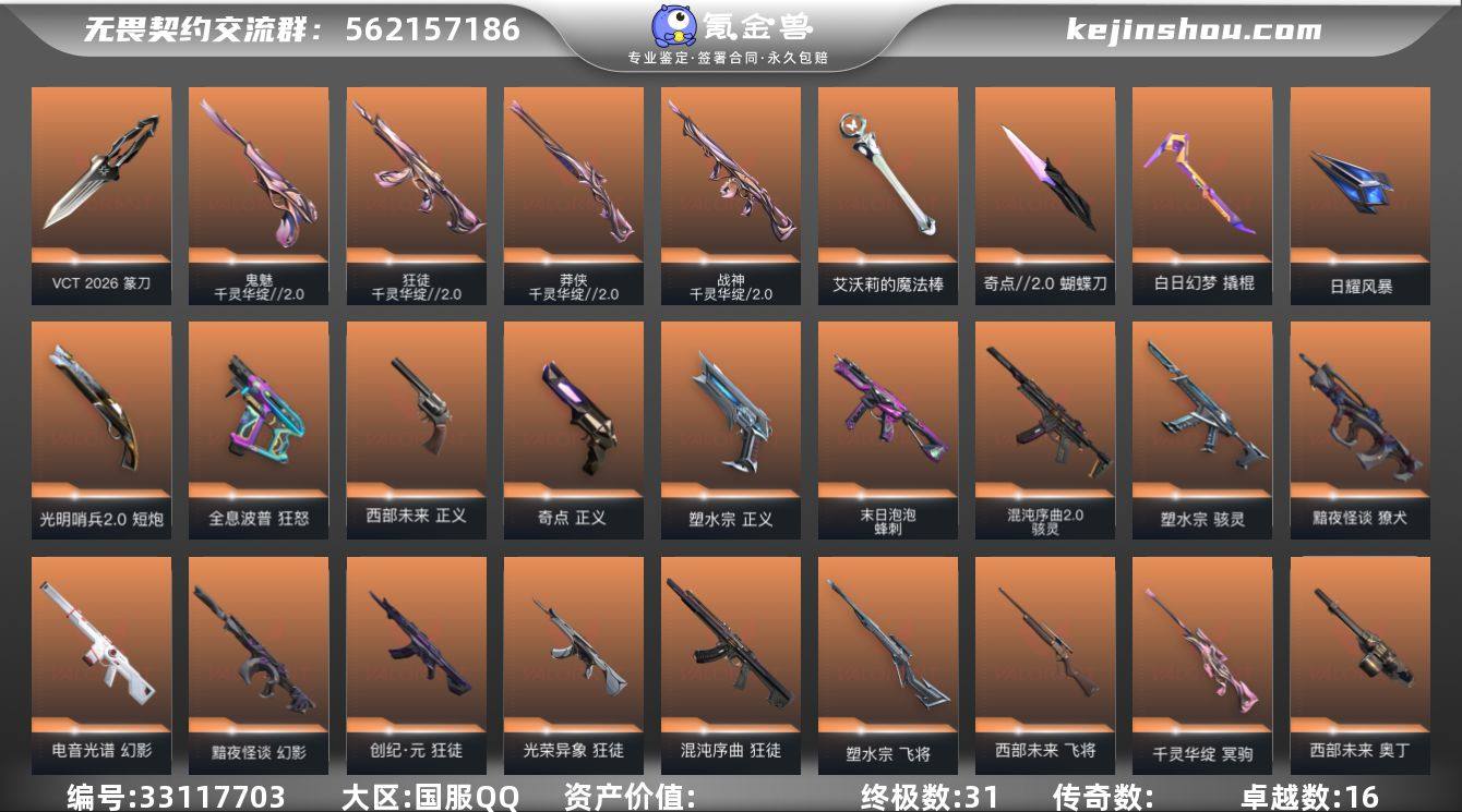 【WWZG464】终极*31/卓越*16/皮肤*96/等级*224/段位:黄金/VCT 2026 赛季套装/回火礼包// V25套装/千灵华绽//2.0 套装/幻棱/炼狱/维斯/暮蝶/钛狐/壹决/铁臂/捷风/雷兹/幽影/不死鸟/贤者/猎枭/蝰蛇/零/芮娜/奇乐/尚勃勒/霓虹/斯凯/夜露/星礈/K/O/海神/盖可/黑梦/钢锁/近战武器-碎心裂刃/VCT 2026 篆刀/流风回雪/蝴蝶刀-奇点//2.0/镭切/艾沃莉的魔法棒/撬棍-白日幻梦/日耀风暴/狂徒-混沌序曲/狂徒-创·纪元/狂徒-光荣异象/狂徒-千灵华绽//2.0/狂徒-冰点凝冻/狂徒-堕天遗武/狂徒-盖亚的复仇/狂徒-日冕雄师/狂徒-赤焰铁骥/幻影-黯夜怪谈/幻影-电音光谱/幻影-侦察力量/戍卫-掠影/獠犬-黯夜怪谈/冥驹-千灵华绽/冥驹-堕天遗武/冥驹-盖世英雄/飞将-塑水宗/飞将-西部未来/莽侠-千灵华绽//2.0/战神-千灵华绽//2.0/战神-浪漫雪国/奥丁-西部未来/判官-天界神兵2.0/雄鹿-紫阙金琅2.0/雄鹿-漫天彩霞/骇灵-塑水宗/骇灵-混沌序曲2.0/蜂刺-末日泡泡/标配-紫阙金琅/追猎-掠影//3.0/正义-奇点/正义-塑水宗/正义-西部未来/正义-掠影/鬼魅-千灵华绽//2.0/鬼魅-盖亚的复仇/鬼魅-耀鳞威龙/狂怒-全息波普/短炮-光明哨兵2.0/分崩离析 卡面/无畏契约:暮蝶 卡面/红鳞松叶 卡面/无畏契约GO!第一卷:芮娜 卡...