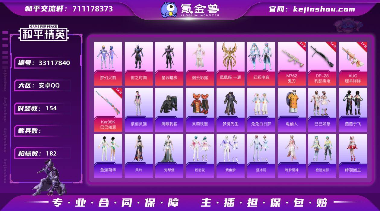 安卓 手Q-7粉装-7特效枪-0载具-3粉色飞行器-54261热力值-12王牌印记-154套装-182枪皮 【热门品类】:粉装-梦幻火箭,套装-龟仙人 【粉色套装】:粉装-梦幻火箭,角色-宙之时溯,角色-星云暗核,角色-烟云彩露,角色-凤凰座 一辉,粉装-幻彩电音,角色-虎痴许褚 【粉色枪皮等级】:AUG-暖羊咩咩(五级),M762-鬼刀(七级),ACE32-萌骑漫游(五级),AKS-74U-森灵之息(五级),Kar98K-巳巳如意(五级),Mk14-福马献瑞(五级),DP-28-豹影疾电(五级) 【粉色枪皮】:AUG-暖羊咩咩,M762-鬼刀,ACE32-萌骑漫游,AKS-74U-森灵之息,Kar98K-巳巳如意,Mk14-福马献瑞,DP-28-豹影疾电 【粉色飞行器】:炫彩糖果飞行器,萌酷奶龙飞行器,辉光之愿飞行器 【粉色降落伞】:梦幻火箭降落伞,第五大道降落伞,闲梦青缨降落伞,万古烈焰降落伞,圣堂之誓降落伞,鬼刀降落伞,喜羊羊与灰太狼降落伞,异瞳寒姬降落伞,炫彩糖果降落伞,罪夜之冕降落伞,辉光之愿降落伞 【稀有套装】:套装-龟仙人,套装-巳巳如意,套装-炫彩糖果,套装-燕燕于飞,套装-鱼渊荷华,角色-风玲,角色-海琴烟,套装-粉恋花,套装-紫幽梦,套装-蓝冰羽,角色-瑰梦爱神,套装-极速光影,角色-绛羽幽主,角色-紫俏灵猫,角色-...