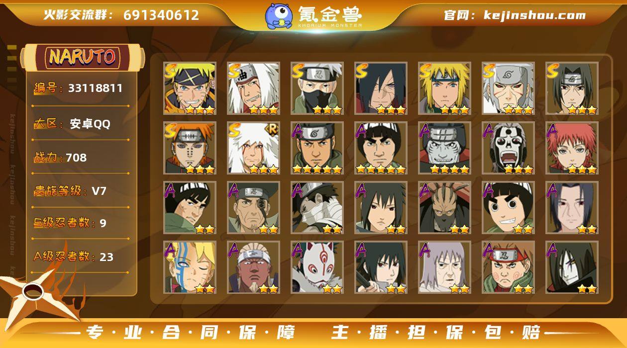 【HYYH1418】V7/战力708W/S忍9/A忍23/四星A-干柿鬼鲛/二星A-我爱罗「疾风传」/五星A-猿飞阿斯玛/三星S-旗木卡卡西「须佐能乎」/2星小南「神驹佑将」/三星S-佩恩「天道」/三星S-漩涡鸣人·宇智波佐助/三星S-波风水门/三星A-蝎/二星A-秋道丁次「忍界大战」/五星A-迈特凯/二星A-漩涡博人「桃式显现」/三星S-千手扉间「秽土转生」/二星A-李洛克「忍界大战」/二星A-土台「忍界大战」/二星A-神秘面具男 「忍者之路」/二星A-蝎「绯流琥」/三星S-自来也「舞之豪杰」/二星A-桃地再不斩「秽土转生」/三星S-自来也 「传说中的三忍」/二星A-飞段/三星A-飞段「死司凭血」/二星A-宇智波鼬 「夏日限定」/二星A-宇智波佐助「万花筒写轮眼」/二星A-宇智波泉奈/三星S-宇智波斑「秽土转生·解」/二星A-艾 「青年」/二星A-迈特凯「青春爆炸」/二星A-宇智波佐助「须佐能乎」/二星A-千代「近松十人卫」/二星A-大蛇丸「晓」/三星S-宇智波鼬 「须佐能乎」