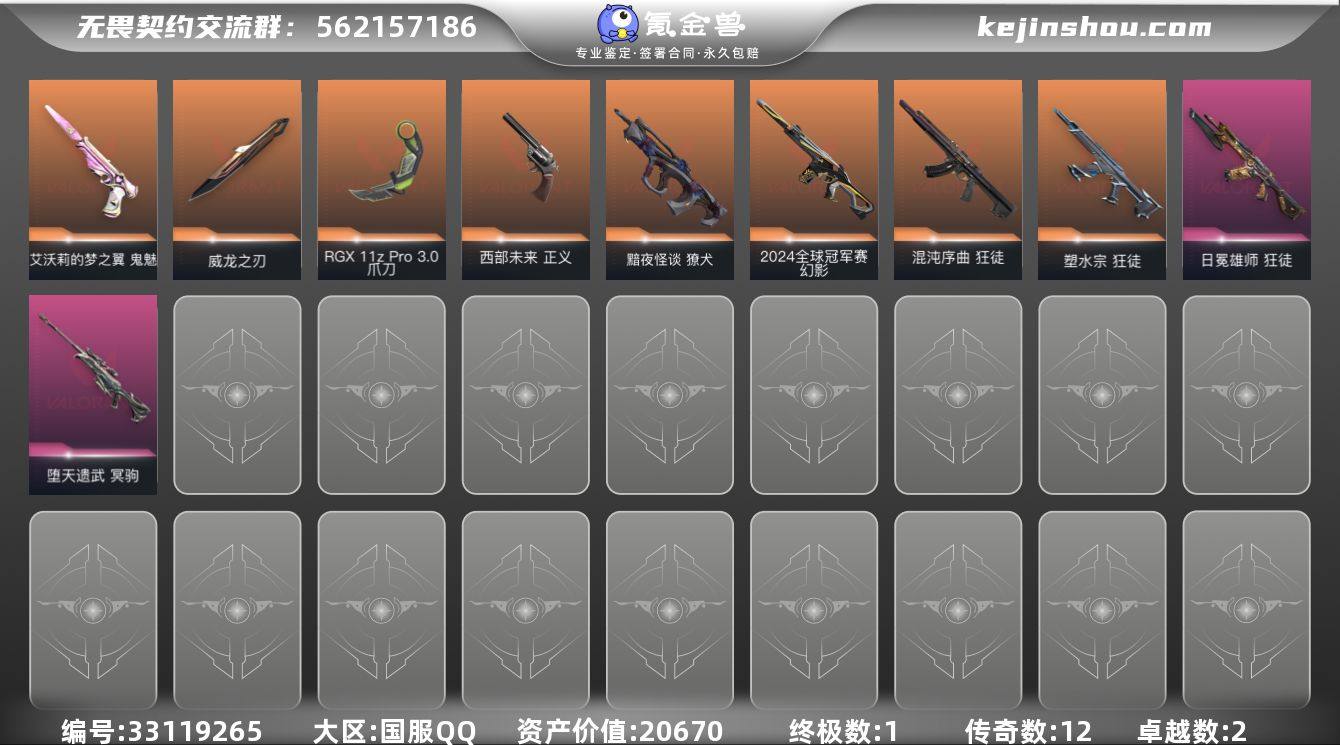 【自带包赔 可赔三倍】:库存价值20670 【限定】: 2024全球冠军赛 幻影 【近战】: RGX 11z Pro//3.0 爪刀, 威龙之刃 【狂徒】: 日冕雄师 狂徒, 混沌序曲 狂徒, 塑水宗 狂徒 【幻影】: 2024全球冠军赛 幻影 【冥驹】: 堕天遗武 冥驹 【正义】: 西部未来 正义 【獠犬】: 黯夜怪谈 獠犬 【鬼魅】: 艾沃莉的梦之翼 鬼魅 【概要】: 总皮肤 69 终极 1 传奇 12 卓越 2 刀皮 英雄 29 LV 201 历史最高:黄金 当前段位:白银三 已使用 1215 R点 剩余 110 R点 卡面、挂饰、其他皮肤请看截图 道具、段位等以实际验号为准。如账号因没有维护,赛季更新等不可抗因素发生变化,不属于账号质量问题"