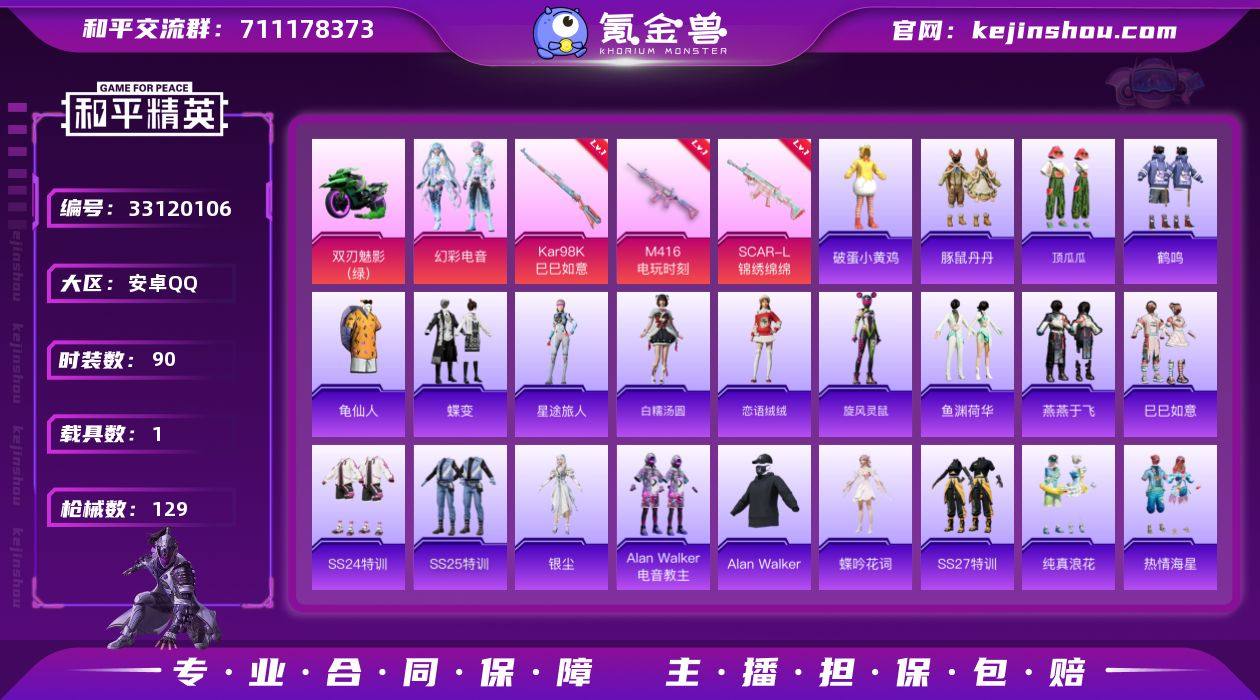 M1047485【1载具-1粉装-3特效枪】安卓手Q-1载具-1粉装-3特效枪-90套装-129枪皮-4王牌印记-坚韧铂金Ⅴ-36892热力值 【1载具】双人摩托-双刃魅影(绿)【1粉装】幻彩电音【3特效枪】SCAR-L-锦绣绵绵[5级],Kar98K-巳巳如意[5级],M416-电玩时刻[5级]【4飞行器】齐天大圣飞行器,异域银装飞行器,招财竹蜻蜓飞行器,空岛之星尾迹【215其它衣服和枪皮】风铃甜诗,SS32特训,酷潮明星,霓虹极客,青春校园,鹤鸣,SS18特训,绮丽涂鸦,幻影武者,焰山流火,耀眼新星,角色-银尘,龙魂突击队,恋语绒绒,顶瓜瓜,异彩先驱,破蛋小黄鸡,黄色伏地魔,蝶变,特训学院,SS30特训,霓虹街区,SS34特训,SS24特训,柠萌假日,黄色运动,焰鹰斗篷,海盐绵绵冰,白色伏地魔,潮流游乐家,魅力单车,都市漫游者,SS19特训,缤纷果语,SS28特训,蓝色运动,战术大师,完美偶像,燕燕于飞,纯真浪花,SS22特训,Alan Walker,SS31特训,龟仙人,荣耀,吉莉礼服,元素星魂,热情海星,白糯汤圆,SS26特训,狙击之神,幽夜迷踪,旋风灵鼠,鱼渊荷华,SS29特训,橘黑制服,团圆交子,星途旅人,竞技名士,福星高照,黑色伏地魔,空岛之星,SS21特训,湖蓝色名流,SS37特训,幻羽潜行,豚鼠丹丹,冷焰舞者,巳巳如意,绯格组合,SS27特训,SS35特训,星梦畅游,音速流光,SS25特训,猛禽...
