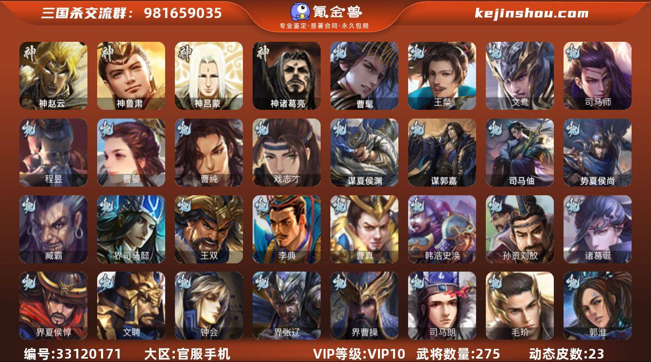 官阶:骠骑将军;VIP等级:VIP10;史诗武将数量:28;动态皮肤数量:23;武将总数:275;史诗宝珠数量:1;将魂数量:5817;神将:3;魏国史诗武将:6;蜀国史诗武将:3;吴国史诗武将:7;群史诗武将:11