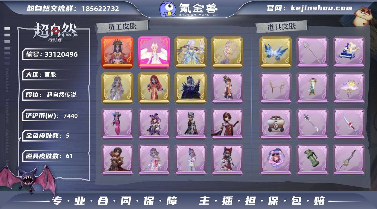 ZR556,红皮:1,粉皮:1,金皮:5,紫皮:14,道具皮:61,外观:巫铃儿-镜生遗梦,小黄-炽天使,莉莉-瑶台梦,零-渡鸦公爵,逍遥-莲华渡,薇薇安-圣光之谕,巫铃儿-镜花辞,艾伦-黎明猎手,阿念-庆宴绮愿,爱丽丝-耀眼的你,兰-千夜星谕,零-搬开山,薇薇安-仙锋小姐,爱丽丝-甜梦派对,艾伦-绒绒对决,莉莉-莓果陷阱,小黄-异色序曲,阿念-迷途僵宝,莉莉-除妖小师妹,零-青云逸歌,巫铃儿-素影瑶光,道具:喷气背包-晶澜灵翼,铲子-圣心之泪,铲子-撒拉弗的祷告,黄牛能量饮料-雪顶奇愿,长鞭-小狗蛇点点鞭,摸金符-祝祷词,夜视仪-金丝眼镜,专业手电-花束般的告白,长鞭-飞天绫,刺刀-小鲨匕首,专业手电-星寂,传送按钮-浮生一梦,腰包-私藏的银河,传送按钮-昆仑镜,急救包-末章心跳,铲子-龙鳞,摸金符-紫霄,短管猎枪-赞萌露比水枪,音响-冬夜暖忆,腰包-宝剑八,传送按钮-逆时审判,夜视仪-心跳眼镜,腰包-月下莲台,刺刀-铂刺与红萼,除颤仪-弦外之音,桃木剑-凤鸣九天,夜视仪-敛花容,长鞭-缚誓之锁,铲子-赞萌波板糖,急救包-土拨鼠捏捏,铲子-卡皮巴拉小黄豚铲,音响-happy猫,黄牛能量饮料-珍珠芭乐莓莓,折扇-露露扇,急救包-蔷薇物语,桃木剑-绯色遗证,长枪-波塞冬,折扇-赴此良宵,音响-月光奏鸣曲,腰包-红运福虎,电击枪-甜蜜泡泡...