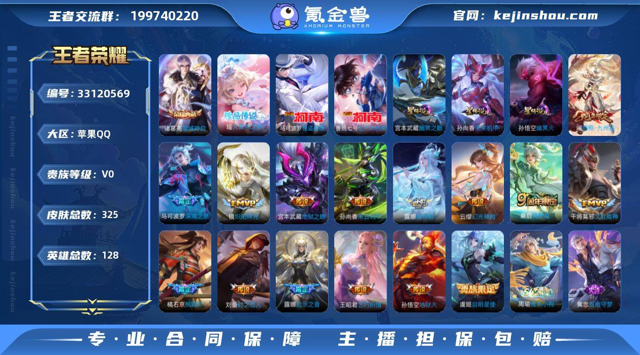 有大耳狗❤️ 贵族等级: V8 英雄数: 127 皮肤数: 320 荣耀水晶: 星域神启 珍品传说: 江户川柯南,怪盗基德,大耳狗之梦 星传说: 未来机甲,幽冥之眼,幽冥火 传说皮: 久胜战神,炽阳神光,末日机甲-孙尚香,地狱火,地狱之眼,乞巧织情,时之恋人-刘备,霜月吟,幻光神枪 限定皮: 冰锋战神,李小龙,梁祝,御风骁将,飞衡,青春决赛季,至尊宝,默契交锋-花木兰,霸王别姬-虞姬,启示之音,深海之息,枫霜尽,五谷丰年,鸣野蒿,逐霄战戟,愿照·九州拓