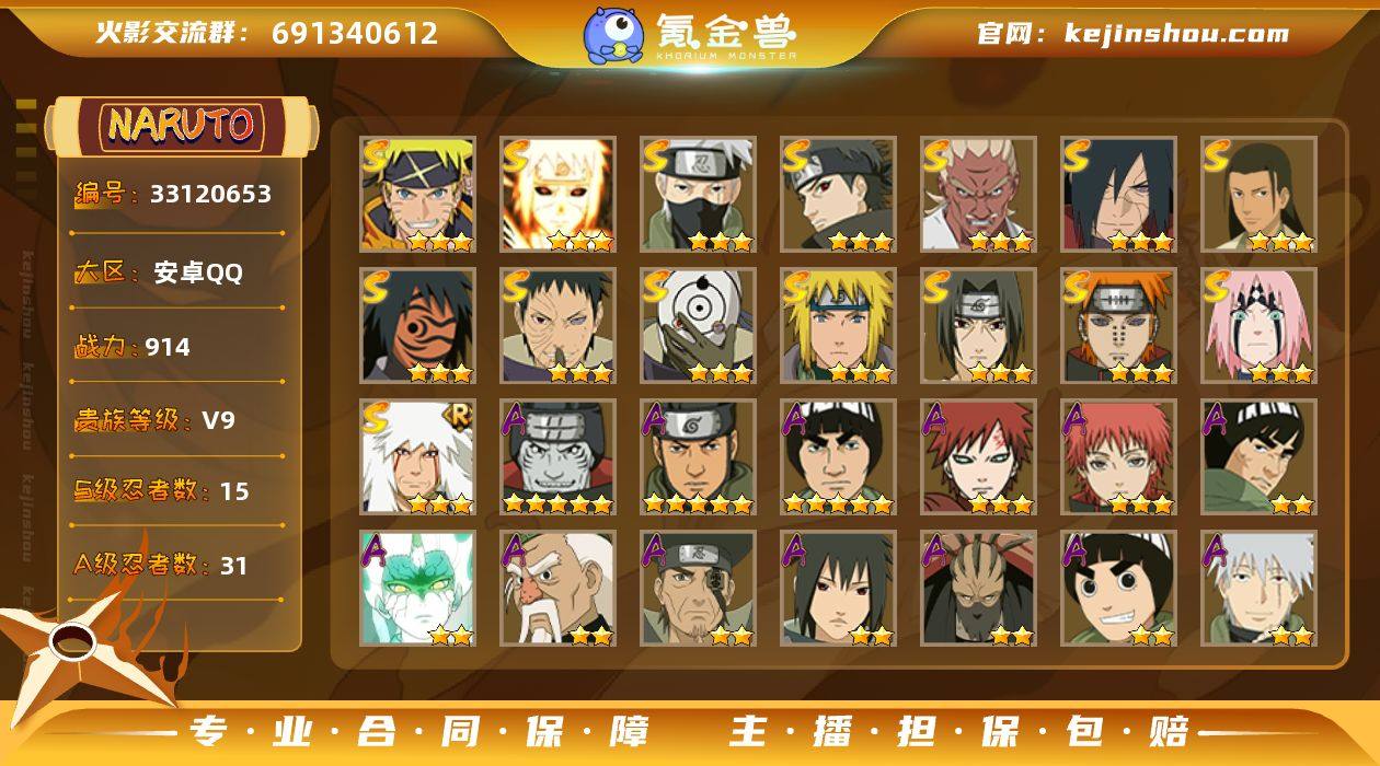 【2743】可免费转苹果 V9 914万战力 15S-31A 传说自来也52片 桃式65片 TT1900 【S级忍者】:宇智波斑「秽土转生·解」(3星),春野樱「忍界大战」(3星),宇智波带土「忍界大战」(3星),艾「忍界大战」(3星),宇智波鼬「须佐能乎」(3星),宇智波止水「须佐能乎」(3星),旗木卡卡西「须佐能乎」(3星),千手柱间「木叶创立」(3星),自来也「舞之豪杰」(3星),波风水门(3星),神秘面具男「红夜之刃」(3星),佩恩「天道」(3星),宇智波斑 「白面具」(3星宇智波斑「白面具」),波风水门「九喇嘛连结」(3星),漩涡鸣人·宇智波佐助(3星) 【A级忍者】:艾「青年」(2星),长门「青年」(2星),波风水门「青年」(2星),迪达拉(2星),迪达拉「秽土转生」(2星),飞段(2星),飞段「死司凭血」(2星),干柿鬼鲛(5星),漩涡博人「桃式显现」(2星),漩涡鸣人「九尾查克拉」(2星),迈特凯(5星),旗木卡卡西「幻之真容」(2星),我爱罗「疾风传」(3星),蝎(3星),蝎「绯流琥」(2星),角都「地怨虞」(2星),猿飞阿斯玛(5星),宇智波鼬(2星),宇智波鼬「夏日限定」(2星),宇智波佐助「须佐能乎」(2星),日向宁次「忍界大战」(2星),长十郎「六代目水影」(2星),李洛克「忍界大战」(2星),黑土「博人传」(...