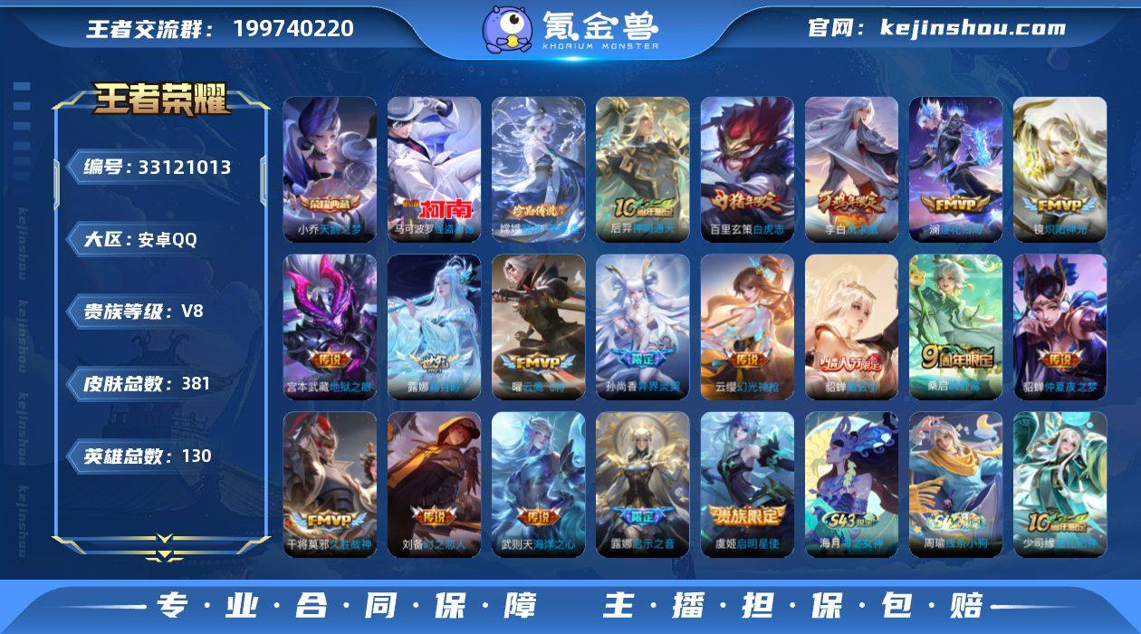 安卓Q-V8-至尊星耀III段位-130英雄-381皮肤-1典藏皮肤-1典藏英雄-2珍品传说-18传说-114史诗 【英雄全皮】:露娜全皮,刘邦全皮,狂铁全皮,敖隐全皮,影全皮,少司缘全皮 【荣耀典藏】:武则天英雄,小乔天鹅之梦 【珍品传说】:嫦娥器灵落星盏,马可波罗怪盗基德 【传说皮肤】:后羿神树通天,云缨幻光神枪,桑启鸣野蒿,貂蝉曦玄引,澜逐花归海,露娜霜月吟,露娜启示之音,孙尚香异界灵契,镜炽阳神光,虞姬启明星使,曜云鹰飞将,刘备时之恋人,干将莫邪久胜战神,百里玄策白虎志,貂蝉仲夏夜之梦,李白凤求凰,宫本武藏地狱之眼,武则天海洋之心 【限定皮肤】:白起狰,李白谪仙醉月,狄仁杰阴阳师,虞姬凯尔特女王,赵云皇家上将,赵云龙胆,墨子神迹守卫,嬴政白昼王子,孙尚香蔷薇恋人,孙尚香异界灵契,庄周蜃楼王,庄周高山流水,阿轲迷踪丽影,孙膑妖精王,扁鹊炼金王,白起夜都怪侠,芈月重明,芈月幻夜卜梦,吕布猎兽之王,元歌云间偶戏,元歌无心,夏侯惇朔风刀,甄姬游园惊梦,曹操烛龙,典韦穷奇,马可波罗暗影游猎,狄仁杰魔术师,狄仁杰万华元夜,达摩星际陆战队,达摩沙漠行僧,项羽海滩派对,老夫子醍醐杖,老夫子航海奇遇记,程咬金演武夺筹,露娜一生所...