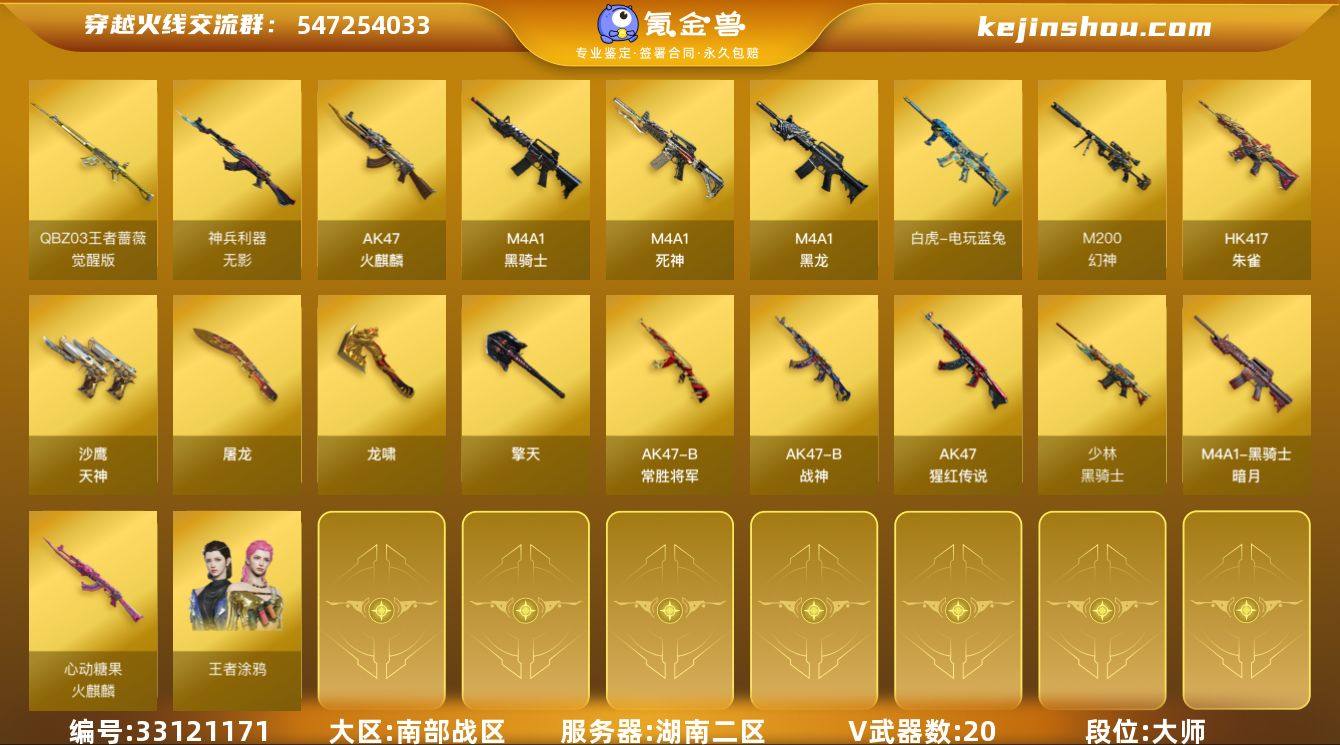湖南二区-21V-1王者武器数-0炫金武器数 【热门武器】:HK417-朱雀,M200-幻神,白虎-电玩蓝兔,M4A1-黑骑士 【音效卡】:M200-幻神音效卡,M4A1-黑骑士音效卡 【皮肤】:幻神-降龙,火麒麟-心动糖果,黑骑士-暗月,黑骑士-少林 【角色】:王者涂鸦,嘉年华灵狐,潘多拉-X,斯沃特-X 【人偶武器】:街机小灰机,迷你超能女侍 【暴走生化】:黑龙吞噬者,双面神,超级对讲机 【挑战大师】:冰龙粉碎者-白马银枪,激光毁灭者III-白马银枪,神圣爆裂者-末日III 【英雄级武器】:AK47-火麒麟,M4A1-黑龙,M4A1-黑骑士,M4A1-死神,HK417-朱雀,无影-神兵利器,AK-47-猩红传说*2,AK47-B-战神,AK47-B-常胜将军,QBZ-03-王者蔷薇-觉醒版,白虎-电玩蓝兔,M200-幻神,沙鹰-天神*2,屠龙,龙啸,擎天*2,闪光弹-幻灵*2 【源级武器】:源·火麒麟,魂·火麒麟-百城,源·雷神,御·雷神-机甲刑天,御·雷神-烈虎*2,御·雷神-小白龙,魂·黑骑士-摸金校尉,魂·黑骑士-现代金属,魂·黑骑士-幻能朋克,源·武圣,源·机械迷城,魂·龙血-锋芒破茧,源·青龙,源-金色蔷薇,源-极光,源·天龙,魂·裁决-新人王绿豆,魂·毁灭-青帝*3,魂·炼狱-玩具枪,加特林-炼狱-掌火,魂·天神-宇航兔兔,魂·屠龙-都是...