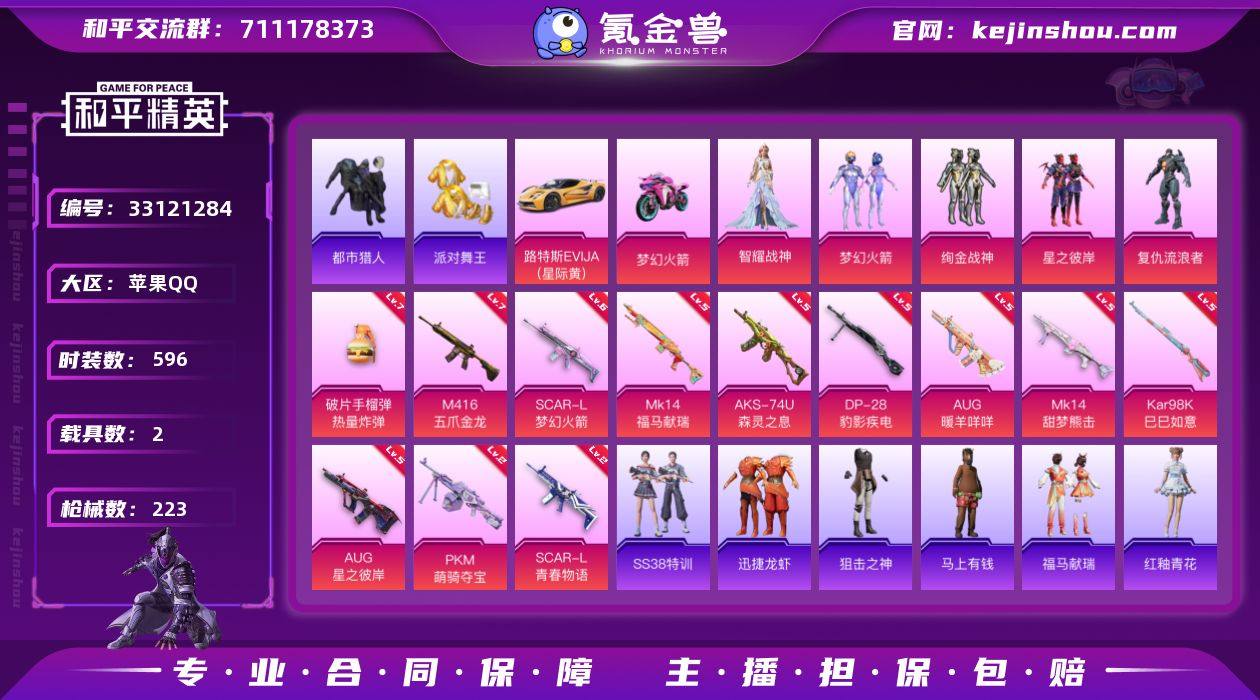 精氪素材号/小雾神同款【火箭少女/都市/金鞋/珣金战神/星之彼岸】满级五爪金龙/满级aug星之彼岸/6级死噶梦幻火箭/暗影哥特/浪漫天命/满级mk14/路特斯/地铁满天赋 实名: 可修改 时装数: 596 载具数: 2 枪械数: 223 战备数: 136 热门装扮: 梦幻火箭(新101),呆萌铁蟹,浪漫波比,梦魇先生,迅捷狂鲨,鹰眼刺客,萌熊伴侣,好奇恐龙,都市猎人,绚金战神,星之彼岸,复仇流浪者,仓鼠灰灰,萌神柯基,奇迹天团,派对舞王,智耀战神 载具: 双人摩托-梦幻火箭,路特斯EVIJA(星际黄) 稀有枪皮: M416五爪金龙,SCAR-L梦幻火箭,AUG星之彼岸,SCAR-L青春物语,Kar98K-巳巳如意,AUG-暖羊咩咩,破片手榴弹-热量炸弹,MK14-甜梦熊击,DP-28-豹影疾电,AKS-74U-森灵之息,PKM-萌骑夺宝