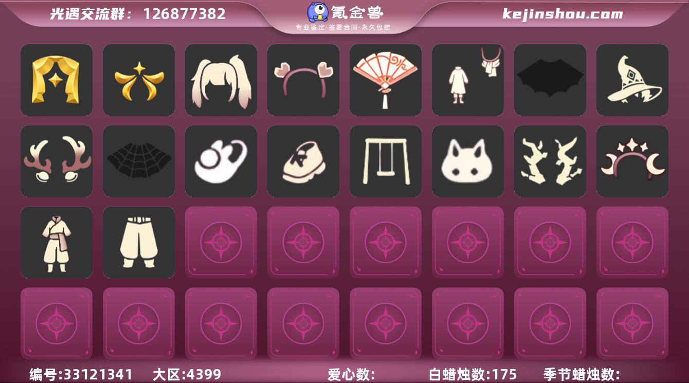 【XT0632】 ✅3季白枭蝶翼,武士裤兔子鞋足力健暗彩巫师蝙蝠蛛网常驻线框斗秋千 ✅区服 :华为 ✅最高:1.911最矮:13.911目前:2.303 ✅资源:蜡烛:175爱心:22翼数量:206 ✅毕业地图:晨岛,云野,雨林,霞谷,墓土 ✅毕业季节:表演季,欧若拉季,筑巢季半 ✅礼包:玉兔拖鞋,悦动跑鞋,史力奇套装,暗彩装扮,优雅领巾,巫师帽,宝骏丹心,双马尾发型,玉兔头饰,雪人头饰,心相印发饰,星月头冠,枯角,圣诞鹿角,常驻线框斗,蝙蝠斗,蛛网斗,青衫落拓,风之旅人,音韵吉他,祥云纸伞,献瑞折扇,秋千,冥龙南瓜 ✅热门物品:白枭,武士裤,白棉裤,搓澡巾,灯笼裤,宝宝裤,矮人面具,黑脸,公主头,粗辫,书虫,正太,高马尾,箬笠,明制帽,花环,虚荣,樱花,猫猫头,红耳机,竖琴,吉他,雨伞