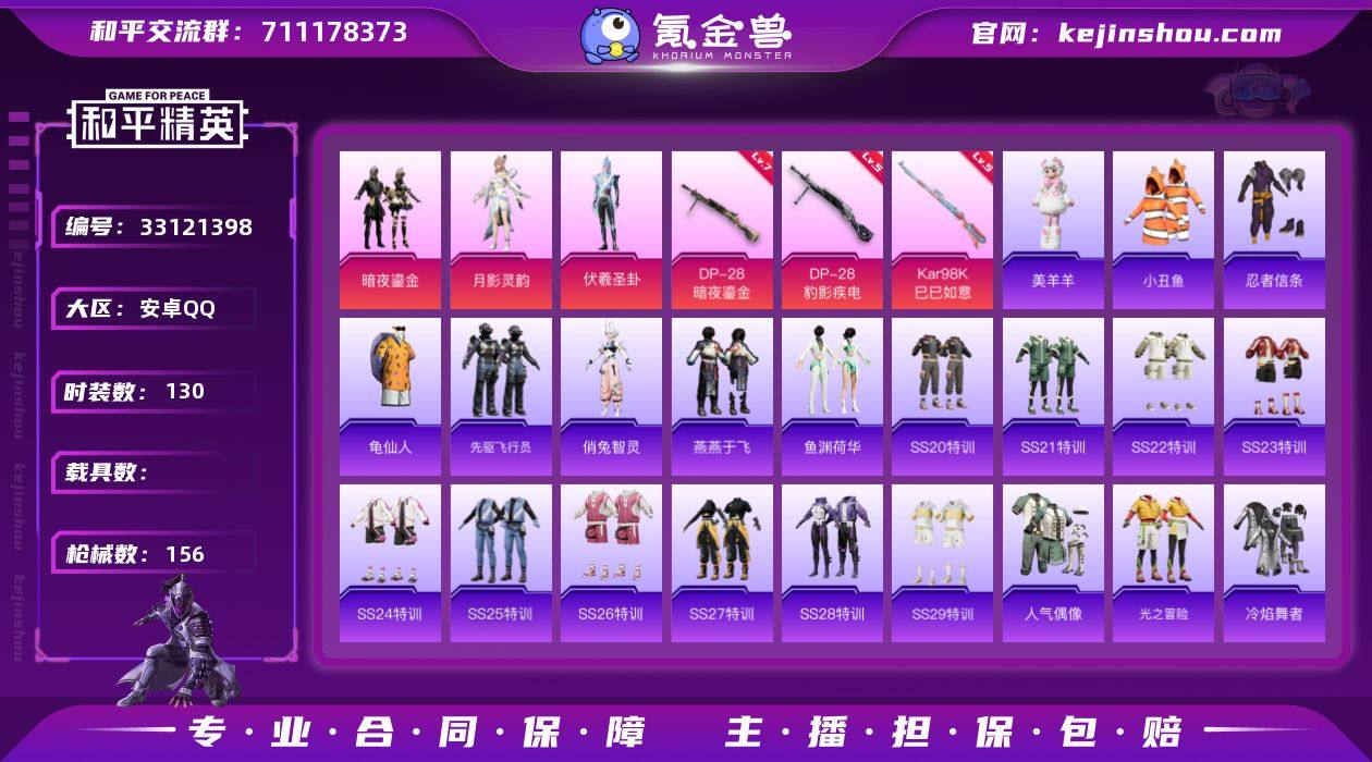 安卓 手Q-3粉装-5特效枪-0载具-0粉色飞行器-43714热力值-9王牌印记-130套装-156枪皮 【热门品类】:套装-小丑鱼,套装-忍者信条,套装-龟仙人 【粉色套装】:粉装-暗夜鎏金,角色-月影灵韵,角色-伏羲圣卦 【粉色枪皮等级】:ACE32-萌骑漫游(五级),Kar98K-巳巳如意(五级),Mk14-福马献瑞(三级),DP-28-暗夜鎏金(七级),DP-28-豹影疾电(五级) 【粉色枪皮】:ACE32-萌骑漫游,Kar98K-巳巳如意,Mk14-福马献瑞,DP-28-暗夜鎏金,DP-28-豹影疾电 【粉色降落伞】:暗夜鎏金降落伞,第五大道降落伞,忍者神龟降落伞,月影灵韵降落伞 【稀有套装】:套装-龟仙人,角色-奈斯,角色-幸运青,套装-迅捷龙虾,套装-先驱飞行员,角色-俏兔智灵,套装-燕燕于飞,套装-鱼渊荷华,玩偶服-美羊羊,套装-雨过天青,套装-红釉青花 【稀有枪皮】:AKM-影袭,AKM-龙的传人,M16A4-幻世战舞者,SCAR-L-夜灯,SCAR-L-玉兔迎春,SCAR-L-甜蜜旋律,SCAR-L-致命红樱,SCAR-L-银碳小老虎,M416-糯团青竹,M416-红色方程式,M416-绯红前夜,M416-蓝色火焰,GROZA-懵萌河马,GROZA-田园牧歌,AUG-天降萌叽,AUG-幻影战神,QBZ-彩虹符号,M762-天降萌叽,M762-暗夜鎏金,M762-绯红前夜,Mk47-妙红点点,G36...