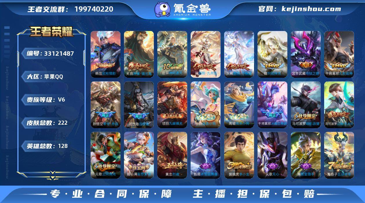 【WZZG147】贵族6/皮肤222/典藏1/传说8/史诗55/英雄128/孙权全皮/敖隐全皮/弑枪猎影/关羽神骥镇沧海/神树通天/愿照·千秋盛/愿照·九州拓/炽阳神光/零号·赤焰/久胜战神/地狱之眼/天穹之誓(s36)/阴阳师/皇家上将/高山流水/玩趣恶龙/王者之锤/云间偶戏/无心/朔风刀(s17)/穷奇(s12)/暗影游猎/山海·玄木吟/魔术师/万华元夜(s22)/星际陆战队-达摩/沙漠行僧(s26)/海滩派对/醍醐杖(s20)/演武夺筹(s23)/金庭之子(s27)/潮玩骑士王/御旌(s15)/云中旅人(s29)/驱傩正仪(s24)/遇见飞天/冰霜恋舞曲/单词大作战/黎明之约/繁星吟游/原初探秘者(s21)/五谷丰年/烈魂/千军破阵(s25)/原初追遂者/混沌棋(s18)/顽趣-梦奇/大漠名商(s28)/疑决卦(s19)/李小龙/擒涛扼浪(s31)/御狮(s13)/御霄(s14)/胡桃异想国/纤云弄巧/御銮(s16)/西部大镖客-猪八戒/拒霜思/狂想玩偶喵/探海日志(s32)/海盐诗旅(s30)/古海寻踪(s33)/蒙恬荣光圣徽/鬼谷子天穹祈灯(S34)/妄想食味/龙武盛年/剑破天穹(s35)/噬灭天穹(s37)/谧流熔炉/荣光之誓/星界战将/九幽镇关/线条小狗-周瑜/线条小狗-小乔/明世隐百晓客/赏金猎手/永昼/天秀·启明/热力回旋/无限星赏官/鹰眼统帅/箭羽风息/猫狗日记-大乔/节奏热浪/星夜王子/功夫厨神/逐浪之夏/特工...