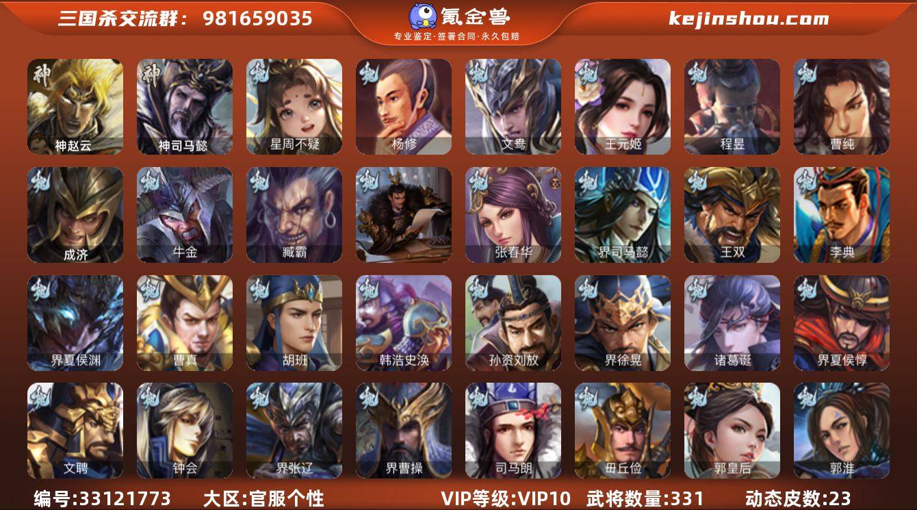 官阶:大将军;VIP等级:VIP10;史诗武将数量:24;动态皮肤数量:23;武将总数:331;史诗宝珠数量:18;将魂数量:7130;神将:2;魏国史诗武将:10;蜀国史诗武将:5;吴国史诗武将:6;群史诗武将:8 神赵云,神司马懿,星周不疑,杨修,王元姬,曹纯,程昱,关索,谋马超,沙摩柯,谯周,花鬘,谋黄盖,骆统,留赞,界徐盛,文鸯,左慈,张让,沮授,界李儒,杜预,兀突骨,司马昭,SP关羽,SP蔡文姬,乐进,曹昂,诸葛诞,朱灵,文聘,SP姜维,张春华,钟会,曹冲,郭淮,满宠,界王异,界曹操,界司马懿,界夏侯惇,界张辽,界许褚,界郭嘉,李典,曹真,韩浩史涣,陈群,曹叡,曹休,钟繇,司马朗,王基,李通,郭皇后,孙资刘放,辛宪英,吕虔,鲁芝,蒯越蒯良,界典韦,界徐晃,杜畿,界曹丕,毌丘俭,界邓艾,张恭,贾逵,界曹植,界满宠,界郭淮,卞夫人,华歆,袁涣,王双,崔琰,曹嵩,谋徐晃,谋于禁,牵招,胡班,成济,牛金,界夏侯渊,臧霸,SP孙尚香,夏侯霸,马良,关兴张苞,廖化,界马岱,关平,简雍,刘封,界法正,界关兴张苞,界刘备,界关羽,界张飞,界赵云,界马超,SP徐庶,吴懿,周仓,张松,刘谌,夏侯氏,糜竺,马忠,孙乾,李严,黄皓,界黄月英,界伊籍,界孟获,界祝融,陈到,界姜维,界刘禅,吕凯,杨仪,邓芝,界简雍,糜夫人,王甫赵累,彭羕,谋法正,谋黄月英,谋张飞,诸葛果,界魏延...