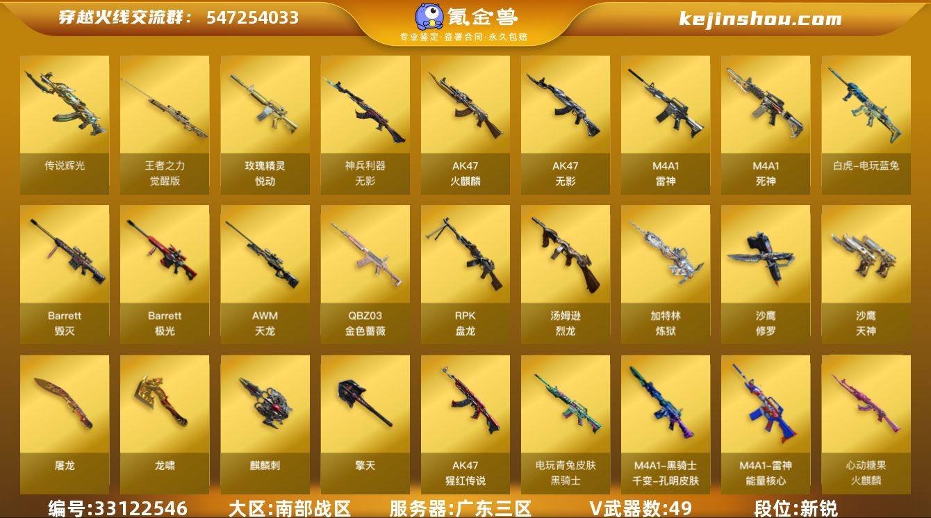 【930975】【双全号 传说辉光,QBZ03-金色蔷薇,白虎-电玩蓝兔,汤姆逊-烈龙*7,RPK-盘龙*5,加特林-炼狱*2,斯泰尔-蝴蝶,沙鹰-修罗*4】广东三区-53V-3王者-0炫金 【传说武器】:传说辉光 【热门武器】:传说辉光,QBZ03-金色蔷薇,白虎-电玩蓝兔,汤姆逊-烈龙*7,RPK-盘龙*5,加特林-炼狱*2,斯泰尔-蝴蝶,沙鹰-修罗*4 【王者炫金武器】:玫瑰精灵-悦动 【皮肤】:雷神-能量核心,火麒麟-心动糖果,毁灭-黑大圣皮肤,M4A1-千变-孔明皮肤,黑骑士-电玩青兔皮肤,无影-能量核心,天龙-能量核心,极光-能量核心,修罗-能量核心*2,天神-暗月,擎天-冠军之击 【角色】:零,葵,樱,审判者,王者-零,芳心审判者,飞虎队-X,嘉年华灵狐,灵狐者-七夕宝贝,麻雀,潘多拉-甜心教官,斯沃特-X,铁骑荣耀,游珑儿 【人偶武器】:王者Barrett-英勇金戈,斯泰尔-蝴蝶,AWM-灵狐-15周年嘉年华,COP-旗袍,Barrett-曼陀罗,M4A1-斯沃特,迷你超能女侍 【暴走生化】:超级对讲机 【挑战大师】:激光毁灭者III-白马银枪 【英雄级武器】:AK47-火麒麟*3,M4A1-雷神*2,AK47-无影,M4A1-死神,无影-神兵利器,QBZ03-金色蔷薇,AK-47-猩红传说,白虎-电玩蓝兔,AWM-天龙,Barrett-毁灭*2,Bar...