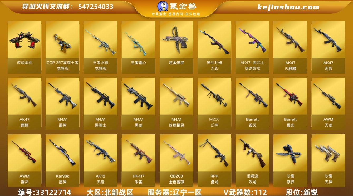 【931260】辽宁一区-114V-3王者-1炫金 【传说武器】:传说幽冥 【热门武器】:传说幽冥,QBZ03-金色蔷薇,HK417-朱雀,M200-幻神,M200-竞技荣光,Kar98K-星神,M4A1-黑骑士,汤姆逊-烈龙*6,RPK-盘龙*6,斯泰尔-蝴蝶,USP-雷暴,沙鹰-修罗*7,炽芒蝶刃*2,炽芒蝶刃-破浪逐光 皮肤 【王者炫金武器】:王者霜心,炫金修罗 【音效卡】:屠龙-动感闪耀 音效卡,天神-动感闪耀 音效卡,烈火-动感闪耀 音效卡,M200-幻神音效卡,M4A1-雷神音效卡,M4A1-黑骑士音效卡 【皮肤】:幻神-星火小队签名臻藏版 皮肤,幻神-传奇欧欧 皮肤,金色蔷薇-破浪逐光 皮肤,雷神-冠军之魄,雷神-源计划2.0专属 皮肤,传奇石头-横秒之巅,火麒麟-心动糖果,毁灭-暗月,毁灭耀金皮肤,黑骑士-冠军之势,无影-暗月*5,无影-能量核心,天启-暗月*2,幻影-破浪逐光 皮肤,战神-粉色甜心皮肤,战神-紫绶金章皮肤*4,战神-流金岁月皮肤*2,天龙-能量核心,极光-能量核心*2,屠龙-破浪逐光 皮肤*2,擎天-冠军之击,炽芒蝶刃-破浪逐光 皮肤 【角色】:葵,电竞教官-云悠悠,王者-瞳-闭月羞花,王者-零,王者炽天使,乔伊教练,暗夜-X,风暴女*2,嘉年华灵狐,娟娟,潘多拉-X,潜龙队-X,斯沃特-X,蜀雪,铁骑...