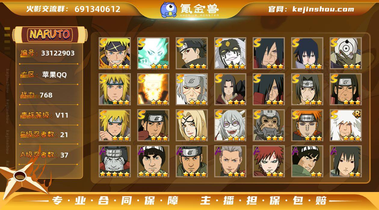 v11 768万战力 21S 37A 1100金币 36高招券 38点券 雾隐村主场景 有熊猫 纲手85片 日斩55片 三代目雷影71片 zp3555 【S级忍者】:半藏「秽土转生」(3星),波风水门「秽土转生」(3星),千手扉间「秽土转生」(3星),千手柱间「秽土转生」(3星),宇智波鼬「秽土转生」(3星),宇智波斑「秽土转生」(3星),宇智波斑「秽土转生·解」(3星),宇智波鼬「须佐能乎」(3星),宇智波止水「须佐能乎」(3星),自来也「舞之豪杰」(3星),纲手「百豪」(3星),千手柱间(3星),波风水门(3星),药师兜「仙人模式」(3星),漩涡鸣人「九喇嘛连结」(3星),佩恩「天道」(3星),宇智波佐助「永恒万花筒」(3星),宇智波斑 「白面具」(3星宇智波斑「白面具」),大筒木桃式(3星),大筒木舍人「最终章」(3星),漩涡鸣人·宇智波佐助(3星) 【A级忍者】:波风水门「青年」(2星),波风水门「新春限定」(2星),迪达拉(2星),迪达拉「秽土转生」(2星),大蛇丸「晓」(2星),奇拉比「忍界大战」(2星),飞段(3星),飞段「死司凭血」(2星),干柿鬼鲛(5星),漩涡博人「桃式显现」(2星),漩涡鸣人「仙人模式」(2星),迈特凯(5星),旗木卡卡西「万花筒写轮眼」(2星),我爱罗「疾风传」(3星),我爱罗「忍界大战」(2星),蝎(...