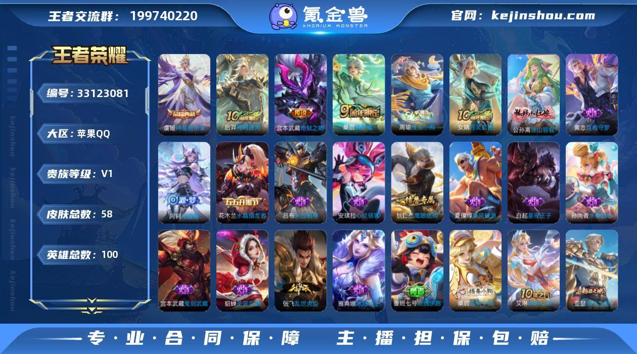 实名: 可修改 性别: 女号 贵族等级: V1 英雄数: 100 皮肤数: 58 荣耀水晶: 神鉴启示录 传说皮: 地狱之眼,神树通天 限定皮: 鸣野蒿 亮点: 【优质装备】:神鉴启示录,地狱之眼,涂山容容