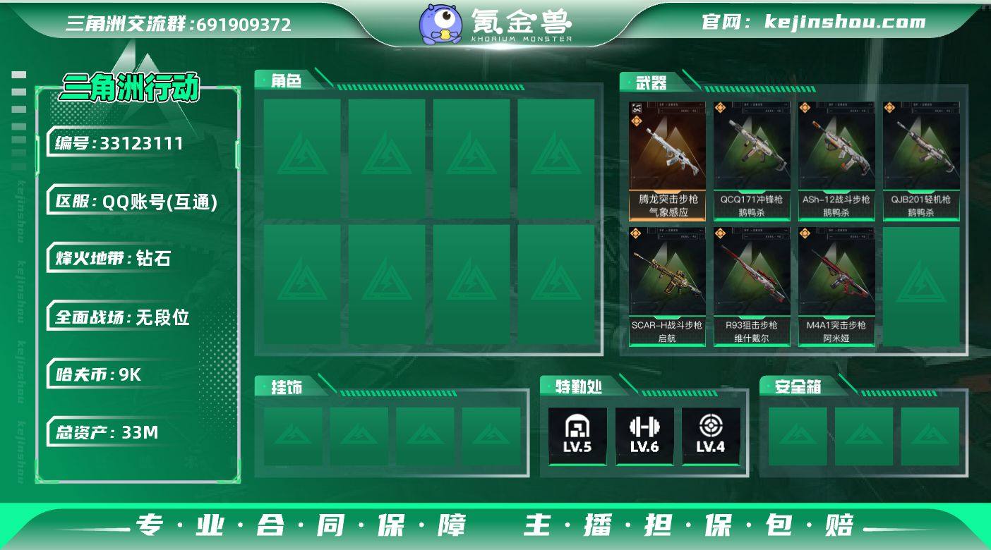 【932425】[17130720]实名: 不可修改 烽火地带段位: 钻石 全面战场段位: 无段位 总资产: 33 哈夫币: 9 传说武器皮肤: 腾龙突击步枪-气象感应(典藏),M4A1突击步枪-阿米娅,R93狙击步枪-维什戴尔,SCAR-H战斗步枪-启航,ASh-12战斗步枪-鹅鸭杀,QCQ171冲锋枪-鹅鸭杀,QJB201轻机枪-鹅鸭杀,近战-暗星,MK47突击步枪-暗星,SR-3M紧凑突击步枪-暗星,近战-处刑者,腾龙突击步枪-马年祥瑞,G18-马年祥瑞,勇士冲锋枪-万金泪冠,腾龙突击步枪-万金泪冠,AWM狙击步枪-万金泪冠,.357左轮-缄花,SR-25射手步枪-缄花,M14射手步枪-缄花,SMG-45冲锋枪-锦绣,K437突击步枪-锦绣,AKM突击步枪-锦绣 亮点: 【优质装备】:腾龙突击步枪-气象感应(典藏)