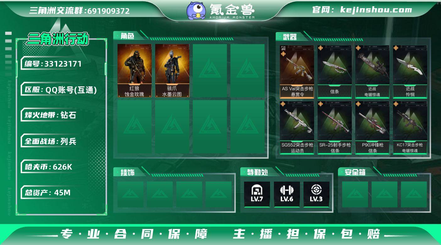 【932635】[17250368]实名: 不可修改 烽火地带段位: 钻石 全面战场段位: 列兵 总资产: 45 哈夫币: 626 干员外观: 红狼-蚀金玫瑰,骇爪-水墨云图 传说武器皮肤: M4A1突击步枪-蚀金玫瑰,近战-怜悯,SCAR-H战斗步枪-水墨云图,M4A1突击步枪-阿米娅,CAR-15突击步枪-阿米娅,AWM狙击步枪-捞点薯条,腾龙突击步枪-捞点薯条,93R-捞点薯条,勇士冲锋枪-能天使-午夜邮差,Vector冲锋枪-能天使-午夜邮差,M250通用机枪-骑士之心,近战-电锯惊魂,S12K霰弹枪-电锯惊魂,M14射手步枪-电锯惊魂,SCAR-H战斗步枪-启航,ASh-12战斗步枪-鹅鸭杀,QCQ171冲锋枪-鹅鸭杀,QJB201轻机枪-鹅鸭杀,M250通用机枪-几何解构,G3战斗步枪-骑士,KC17突击步枪-电锯惊魂,AS Val突击步枪-悬赏令(典藏),近战-信条,P90冲锋枪-信条,SR-25射手步枪-信条,SG552突击步枪-运动员,M14射手步枪-蛮荒,K416突击步枪-行动记录,腾龙突击步枪-马年祥瑞,G18-马年祥瑞,腾龙突击步枪-万金泪冠,.357左轮-缄花,SR-25射手步枪-缄花,M14射手步枪-缄花 亮点: 【优质装备】:近战-怜悯
