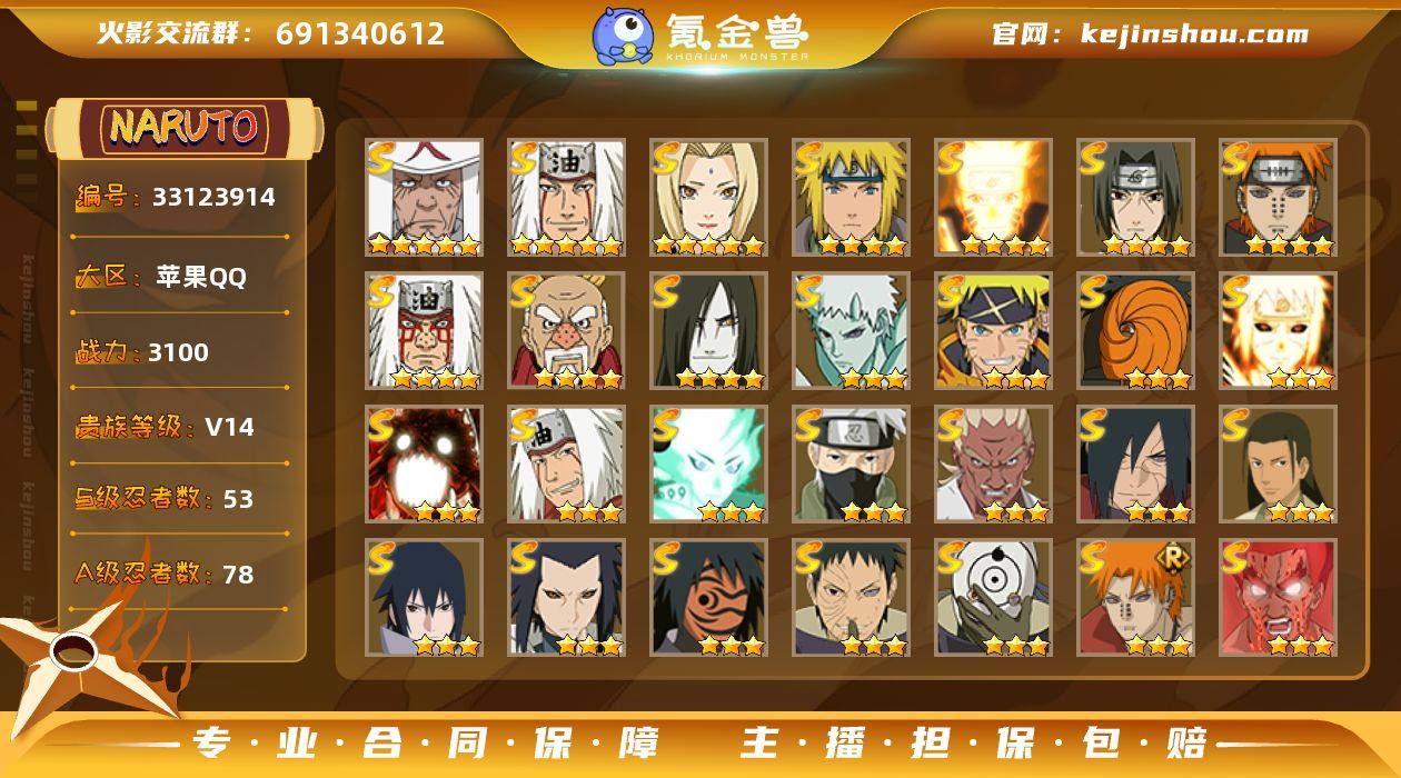 【微氪1.6w 高战力 本服57名】y7547 战力3100w 53s 78a 熊猫 蓝猫 夏日乌鸦 2个298a 12个198a 1w2金币 大福袋剩余12天 25忍法帖已开57级 传说时装全 漂泊六道+面麻+漂泊扉间时装 博人传黑土传承奥义 雨隐村主场景 红色猛兽个性名片 五星自来也 纲手 三代火影 77片烈斗