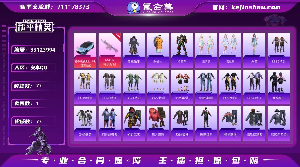 【LHPD854】77套装/枪械1/装备79/载具1/战备69/王牌印记4/热力值26007/五级M416-电玩时刻/龟仙人/路特斯ELETRE(冰川蓝)/M416电玩时刻/电糖天使飞行器/洛神天依降落伞/垂柳戏鸭降落伞/精灵梦叶罗丽降落伞/拉斐尔/云朵鹅/雪绒豹/乐音/AKM-环太平洋/AKM-虎虎生威/AKM-龙的传人/M16A4-幻世战舞者/SCAR-L-玉兔迎春/SCAR-L-红色方程式/SCAR-L-冷漠罗丽/M416-红色方程式/AUG-天降萌叽/AUG-耀粉歌者/QBZ-彩虹符号/M762-云朵鹅/AC-VAL-天降萌叽/蜜獾-娇憨猪猪/UZI-天降萌叽/UZI-娇憨猪猪/UMP45-生命誓言/UMP45-蓝色火焰/Vector-焰鹰斗篷/Vector-生命誓言/汤姆逊-天降萌叽/汤姆逊-环太平洋/Kar98K-炫彩节奏/M24-炫彩节奏/AWM-焰鹰斗篷/SLR-娇憨猪猪/SVD-云朵鹅/S686-红色方程式/S1897-炫彩节奏/S12K-破晓战魂/S12K-娇憨猪猪/S12K-幻世战舞者/DBS-焰鹰斗篷/SPAS-12-云朵鹅/M249-彩虹符号/M249-糯团青竹/DP-28-焰鹰斗篷/DP-28-彩虹符号/MG3-幻世战舞者/沙漠之鹰-云朵鹅/大砍刀-云朵鹅/SS17特训/SS19特训/SS20特训/SS21特训/SS22特训/SS23特训/SS25特训/SS27特训/SS28特训/甜酷狙击/冷焰舞者/幻世战舞者/幻影武者/怒火燎原/战地督导/极速红龙/橘黑制服/海岛探路者/深蓝色名流/湖蓝色名流/炫...