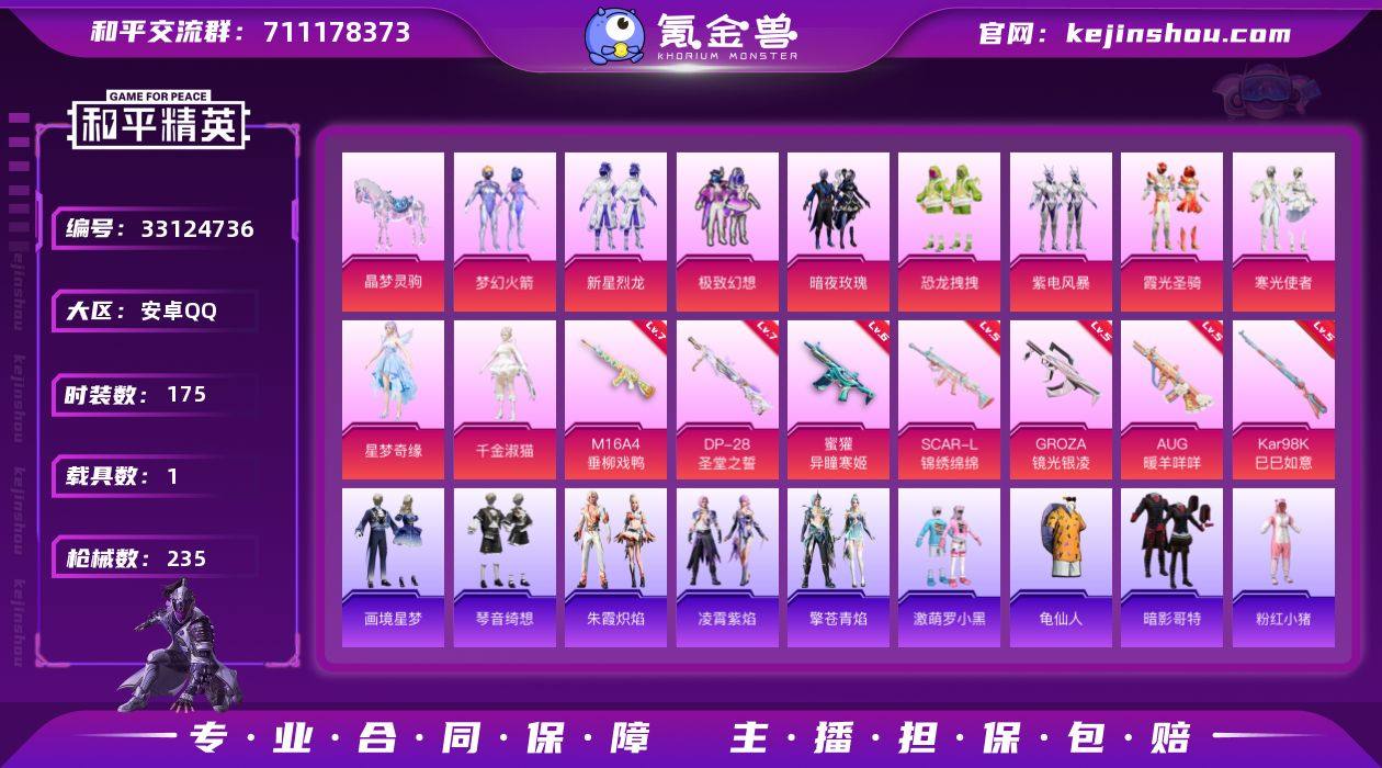 【LHPD616】175套装/枪械7/装备350/载具1/战备190/王牌印记19/热力值78847/七级M16A4-垂柳戏鸭/五级SCAR-L-锦绣绵绵/五级GROZA-镜光银凌/五级AUG-暖羊咩咩/六级蜜獾-异瞳寒姬/五级Kar98K-巳巳如意/七级DP-28-圣堂之誓/梦幻火箭(新101)/龟仙人/暗影哥特/粉红小猪/新星烈龙/极致幻想/暗夜玫瑰/恐龙拽拽/紫电风暴/霞光圣骑/寒光使者/星梦奇缘/千金淑猫/晶梦灵驹/M16A4垂柳戏鸭/SCAR-L-锦绣绵绵/GROZA-镜光银凌/AUG-暖羊咩咩/蜜獾-异瞳寒姬/Kar98K-巳巳如意/DP-28圣堂之誓/炫彩糖果飞行器/祥瑞起舞飞行器/星夜魔法师飞行翼/凤舞九天飞行器/月下星之子飞行器/梦幻火箭降落伞/暗夜玫瑰降落伞/天之羽翼降落伞/恐龙拽拽降落伞/冷魅冰骑降落伞/圣光天使降落伞/旋转彩虹降落伞/仲夏莫吉托降落伞/圣堂之誓降落伞/蜜语绒猫降落伞/精灵梦叶罗丽降落伞/时空协奏降落伞/千金淑猫降落伞/临安公主降落伞/幻海仙踪降落伞/幻彩电音降落伞/炫彩糖果降落伞/航行童话/巳巳如意/套装-雪国风尚/炫彩糖果/雏菊兔兔/萝兰蝴蝶/糖糖葫芦/青团波波/棉花软糖/都市丽猫/摩登魅猫/许七安/临安公主/怀庆长公主/燕燕于飞/鱼渊荷华/晶灵使者/晶辉守护/白辉玉蕊/雪夜云雾/紫幽梦/蓝冰羽/鲛海歌灵/朱霞炽焰/凌霄紫焰...