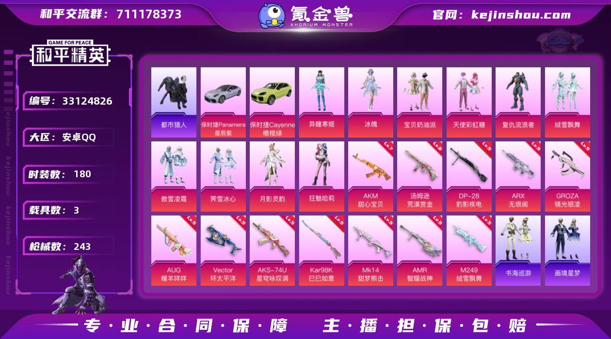 【LHPD641】180套装/枪械14/装备302/载具3/战备161/王牌印记7/热力值84352/七级AKM-甜心宝贝/五级GROZA-镜光银凌/五级AUG-暖羊咩咩/五级ARX-无垠阁/五级Vector-环太平洋/六级汤姆逊-荒漠赏金/五级AKS-74U-星穹咏叹调/五级Kar98K-巳巳如意/五级MK14-甜梦熊击/五级Mk14-福马献瑞/五级AMR-智耀战神/五级M249-绒雪飘舞/五级DP-28-豹影疾电/二级信号枪-金乌曜日/二级暮色玫影-艾丽娅/暮色玫影-艾丽娅/都市猎人/小丑鱼/军刀雅典娜/忍者信条/龟仙人/宝贝奶油派/天使彩虹糖/复仇流浪者/绒雪飘舞/傲雪凌霜/霁雪冰心/月影灵韵/狂魅哈莉/冰魄/异瞳寒姬/角色-罪夜之冕/保时捷Panamera(星辰紫)/保时捷Cayenne(橄榄绿)/暮色幽蹄/AKM甜心宝贝/GROZA-镜光银凌/AUG-暖羊咩咩/ARX-无垠阁/Vector环太平洋/汤姆逊荒漠赏金/AKS-74U-星穹咏叹调/Kar98K-巳巳如意/MK14-甜梦熊击/Mk14-福马献瑞/AMR-智耀战神/M249绒雪飘舞/DP-28-豹影疾电/信号枪-金乌曜日/炫彩糖果飞行器/星夜魔法师飞行翼/绒雪飘舞飞行器/暮色之舞飞行器/绝对恒星降落伞/幻影战神降落伞/甜心宝贝降落伞/梦幻火箭降落伞/暗夜玫瑰降落伞/洛神天依降落伞/环太平洋降落伞/绒雪飘舞降落伞/垂柳戏鸭降落伞/未来歌姬降落伞/樱桃泡泡降落伞/星...