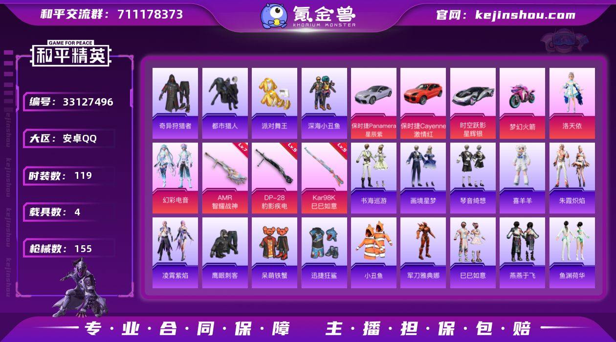 【LHPX1601】119套装/枪械6/装备177/载具4/战备99/王牌印记5/热力值46982/五级ACE32-萌骑漫游/五级AKS-74U-森灵之息/五级Kar98K-巳巳如意/五级Mk14-福马献瑞/七级AMR-智耀战神/五级DP-28-豹影疾电/都市猎人/派对舞王/深海小丑鱼/小丑鱼/奇异狩猎者/军刀雅典娜/洛天依/幻彩电音/时空跃影(星辉银)/保时捷Panamera(星辰紫)/保时捷Cayenne(激情红)/双人摩托-梦幻火箭/ACE32-萌骑漫游/AKS-74U-森灵之息/Kar98K-巳巳如意/Mk14-福马献瑞/AMR-智耀战神/DP-28-豹影疾电/炫彩糖果飞行器/脆鲨七海飞行器/梦幻火箭降落伞/洛神天依降落伞/精灵梦叶罗丽降落伞/英伦信使降落伞/绯果甜心降落伞/星穹咏叹调降落伞/巳巳如意/套装-雪国风尚/套装-马上有钱/燕燕于飞/鱼渊荷华/粉恋花/紫幽梦/蓝冰羽/星渊小夜曲/朱霞炽焰/凌霄紫焰/喜羊羊/书海巡游/画境星梦/琴音绮想/角色-碧青流霞/套装-雨过天青/套装-红釉青花/AKM-彩虹符号/AKM-破晓战魂/AKM-缤纷海域/AKM-龙的传人/M16A4-幻世战舞者/SCAR-L-炫彩节奏/SCAR-L-玉兔迎春/M416-红色方程式/M416-蓝色火焰/GROZA-彩虹符号/GROZA-影袭/AUG-耀粉歌者/QBZ-彩虹符号/QBZ-洛神天依/M762-天降萌叽/M762-彩虹符号/Mk47-虹云熊熊/G36C-星穹咏叹调/AC-VAL-天降...